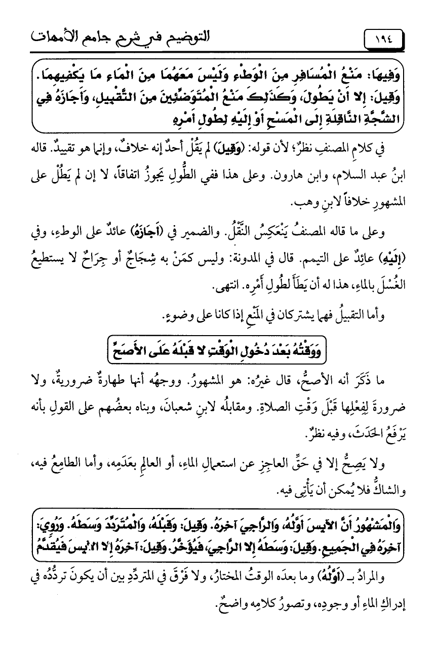 وَفِيهَا: مَنْعُ الْمُسَافِرِ مِنَ الْوَطْءِ وَلَيْسَ مَعَهُمَا مِنَ الْمَاءِ مَا يَكْفِيهمَا. وَقِيلَ: إِلا أَنْ يَطُولَ، وَكَذَلِكَ مَنْعُ الْمُتَوَضِّئِينَ مِنَ التَّقْبِيلِ، وَأَجَازَهُ فِي الشَّجَّةِ النَّاقِلَةِ إِلَى الْمَسْحِ أَوْ إِلَيْهِ لِطُولِ أَمْرِهِ.