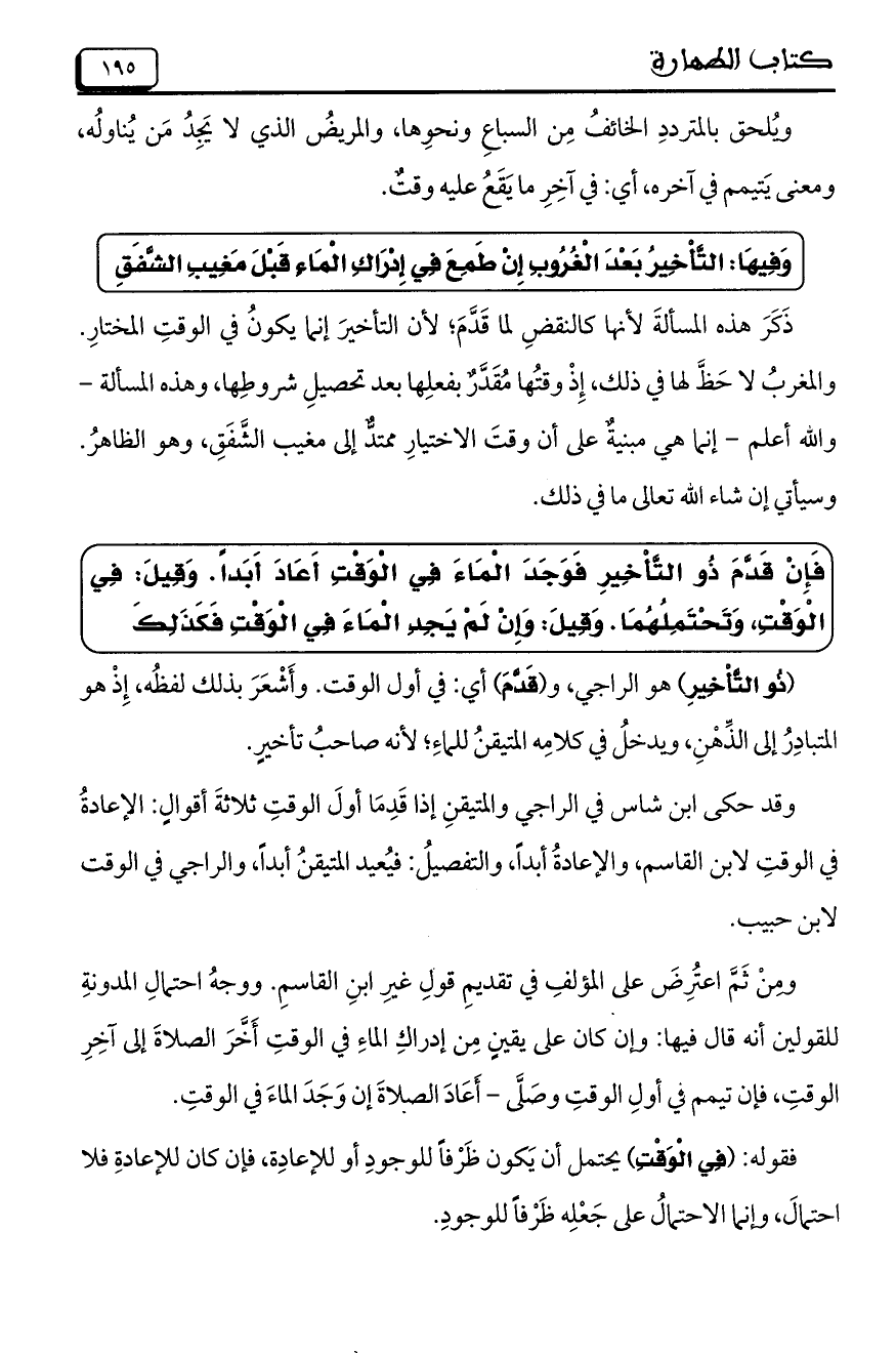ومِنْ ثَمَّ اعتُرِضَ على المؤلفِ في تقديمِ قولِ غيرِ ابنِ القاسمِ. ووجهُ احتمالِ المدونةِ للقولين أنه قال فيها: وإن كان على يقينٍ مِن إدراكِ الماءِ في الوقتِ أَخَّرَ الصلاةَ إلى آخِرِ الوقتِ، فإن تيمم في أولِ الوقتِ وصَلَّى– أَعَادَ الصلاةَ إن وَجَدَ الماءَ في الوقتِ.