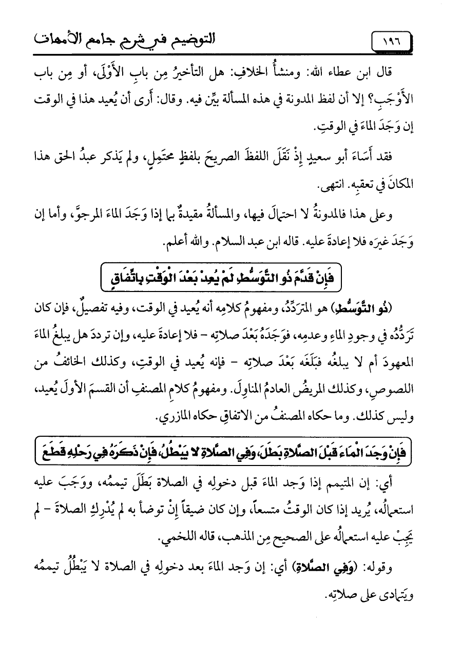 قال ابن عطاء الله: ومنشأُ الخلافِ: هل التأخيرُ مِن بابِ الأَوْلَى، أو مِن باب الأَوْجَبِ؟ إلا أن لفظ المدونة في هذه المسألة بيِّن فيه. وقال: أَرى أن يُعيد هذا في الوقت إن وَجَدَ الماءَ في الوقتِ.