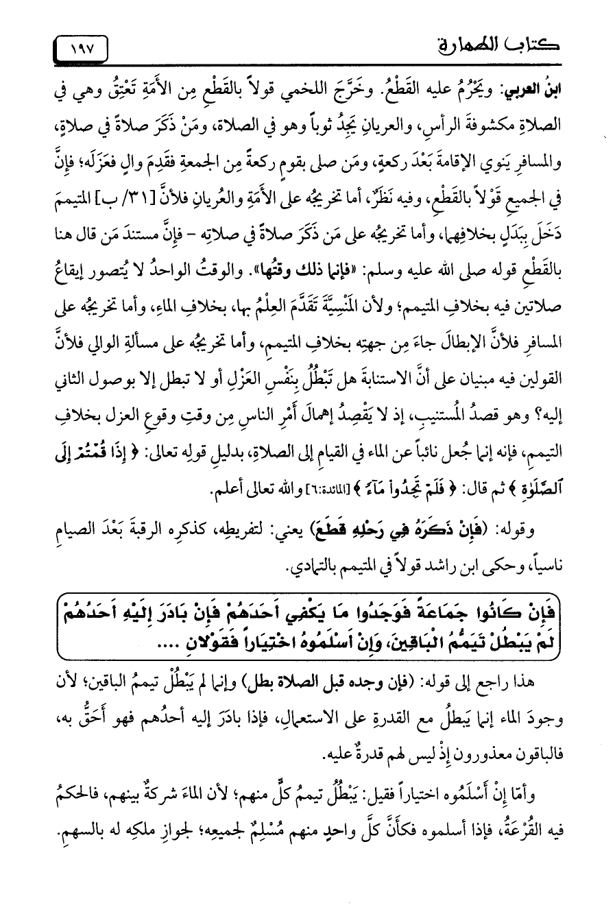 ابنُ العربي: ويَحْرُمُ عليه القَطْعُ. وخَرَّجَ اللخمي قولاً بالقَطْعِ من الأَمَةِ تَعْتِقُ وهي في الصلاةِ مكشوفةَ الرأسِ، والعريانِ يَجِدُ ثوباً وهو في الصلاة، ومَنْ ذَكَرَ صلاةً في صلاةٍ، والمسافرِ يَنوي الإقامةَ بَعْدَ ركعةٍ، ومَن صلى بقومٍ ركعةً من الجمعةِ فقَدِمَ والٍ فعَزَلَه؛ فإِنَّ في الجميعِ قَوْلاً بالقَطْعِ، وفيه نَظَرٌ، أما تخريجُه على الأَمَةِ والعُريانِ فلأنَّ [31/ب] المتيممَ دَخَلَ بِبَدَلٍ بخلافِهما، وأما تخريجُه على مَن ذَكَرَ صلاةً في صلاتِه– فإِنَّ مستندَ مَن قال هنا بالقَطْعِ قوله صلى الله عليه وسلم: "فإنما ذلك وقتُها". والوقتُ الواحدُ لا يُتصور إيقاعُ صلاتين فيه بخلافِ المتيمم؛ ولأن المَنْسِيَّةَ تَقَدَّمَ العِلْمُ بها، بخلافِ الماءِ، وأما تخريجُه على المسافرِ فلأنَّ الإبطالَ جاءَ مِن جهتِه بخلافِ المتيممِ، وأما تخريجُه على مسألةِ الوالي فلأنَّ القولين فيه مبنيان على أنَّ الاستنابةَ هل تَبْطُلُ بِنَفْسِ العَزْلِ أو لا تبطل إلا بوصول الثاني إليه؟ وهو قصدُ المُستنيبِ، إذ لا يَقْصِدُ إهمالَ أَمْرِ الناسِ مِن وقتِ وقوعِ العزل بخلافِ التيممِ، فإنه إنما جُعل نائباً عن الماء في القيامِ إلى الصلاةِ، بدليلِ قوله تعالى: {إِذَا قُمْتُمْ إِلَى الصَّلاةِ} ثم قال: {فَلَمْ تَجِدُوا مَاءً} [المائدة: 6] والله تعالى أعلم.