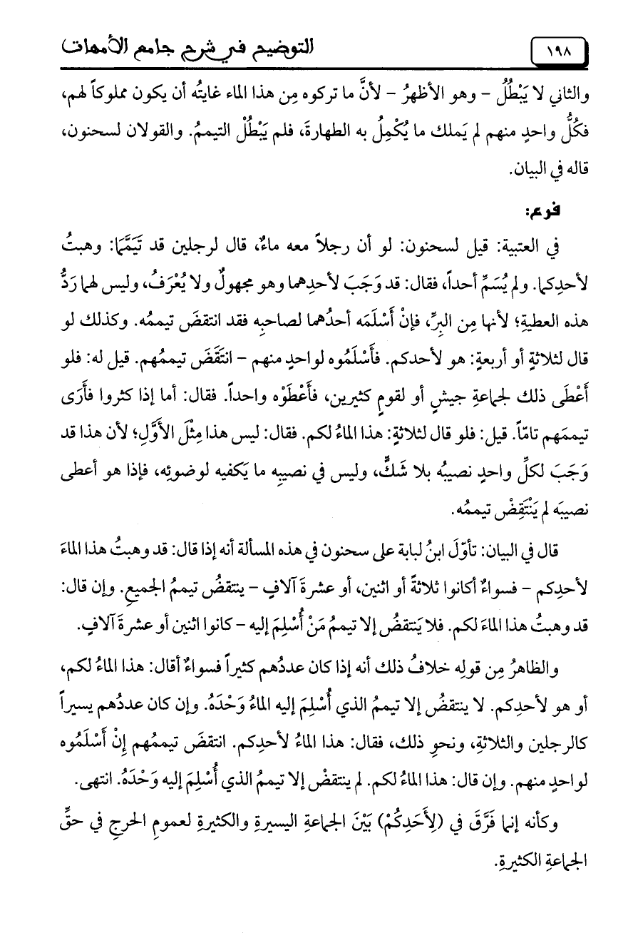في العتبية: قيل لسحنون: لو أن رجلاً معه ماءٌ، قال لرجلين قد تَيَمَّمَا: وهبتُ لأحدِكما. ولم يُسَمِّ أحداً، فقال: قد وَجَبَ لأحدِهما وهو مجهولٌ ولا يُعْرَفُ، وليس لهما رَدُّ هذه العطيةِ؛ لأنها مِن البِرِّ، فإنْ أَسْلَمَه أحدُهما لصاحبِه فقد انتقضَ تيممُه. وكذلك لو قال لثلاثةٍ أو أربعةٍ: هو لأحدكم. فأَسْلَمُوه لواحدٍ منهم– انتَقَضَ تيممُهم. قيل له: فلو أَعْطَى ذلك لجماعةِ جيشٍ أو لقومٍ كثيرين، فأَعْطَوْه واحداً. فقال: أما إذا كثروا فأَرَى تيممَهم تامّاً. قيل: فلو قال لثلاثةٍ: هذا الماءُ لكم. فقال: ليس هذا مِثْلَ الأَوَّلِ؛ لأن هذا قد وَجَبَ لكلِّ واحدٍ نصيبهُ بلا شَكٍّ، وليس في نصيبهِ ما يَكفيه لوضوئِه، فإذا هو أعطى نصيبَه لم يَنْتَقِضْ تيممُه.