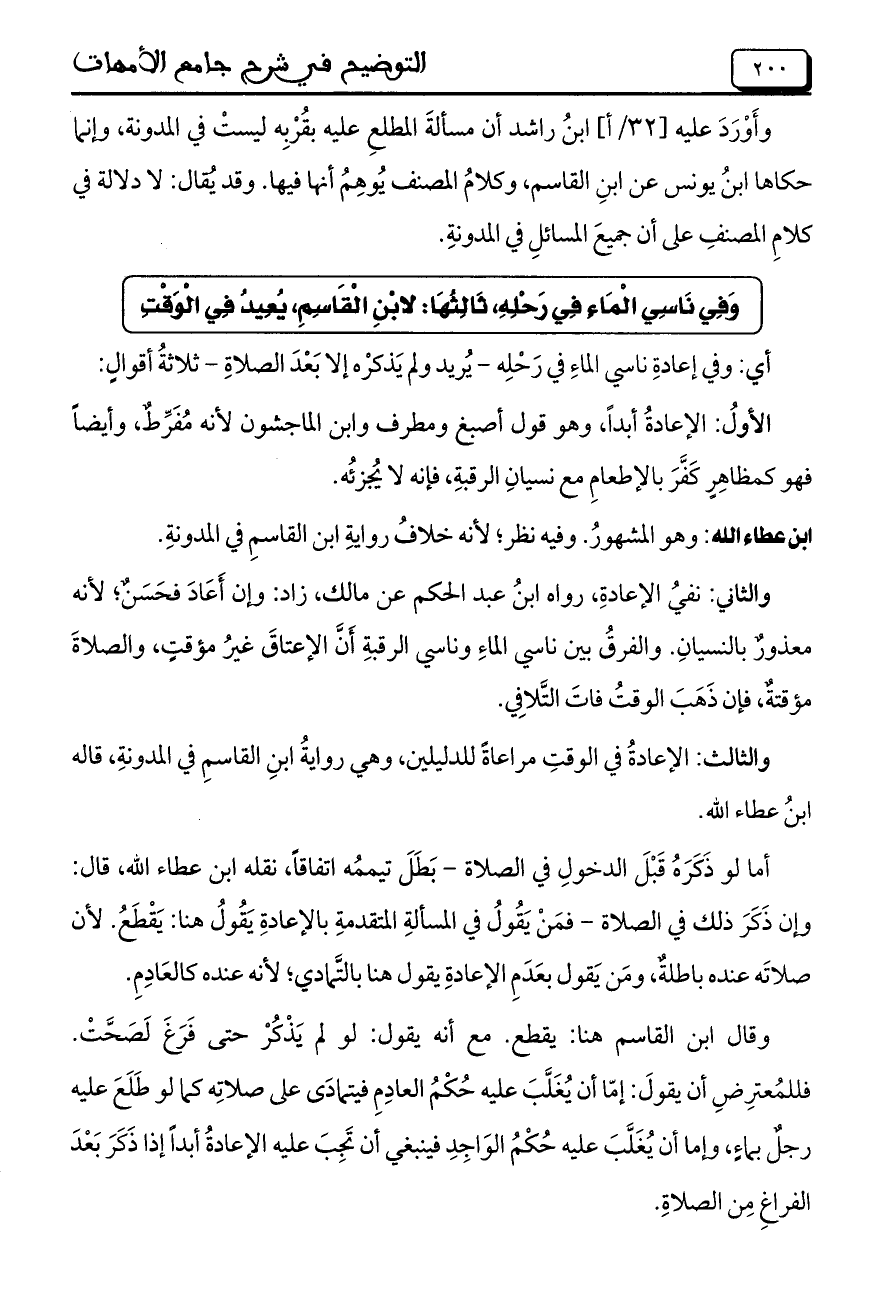 ابن عطاء الله: وهو الْمَشْهُورِ. وفيه نظر؛ لأنه خلافُ روايةِ ابن القاسمِ في المدونةِ.