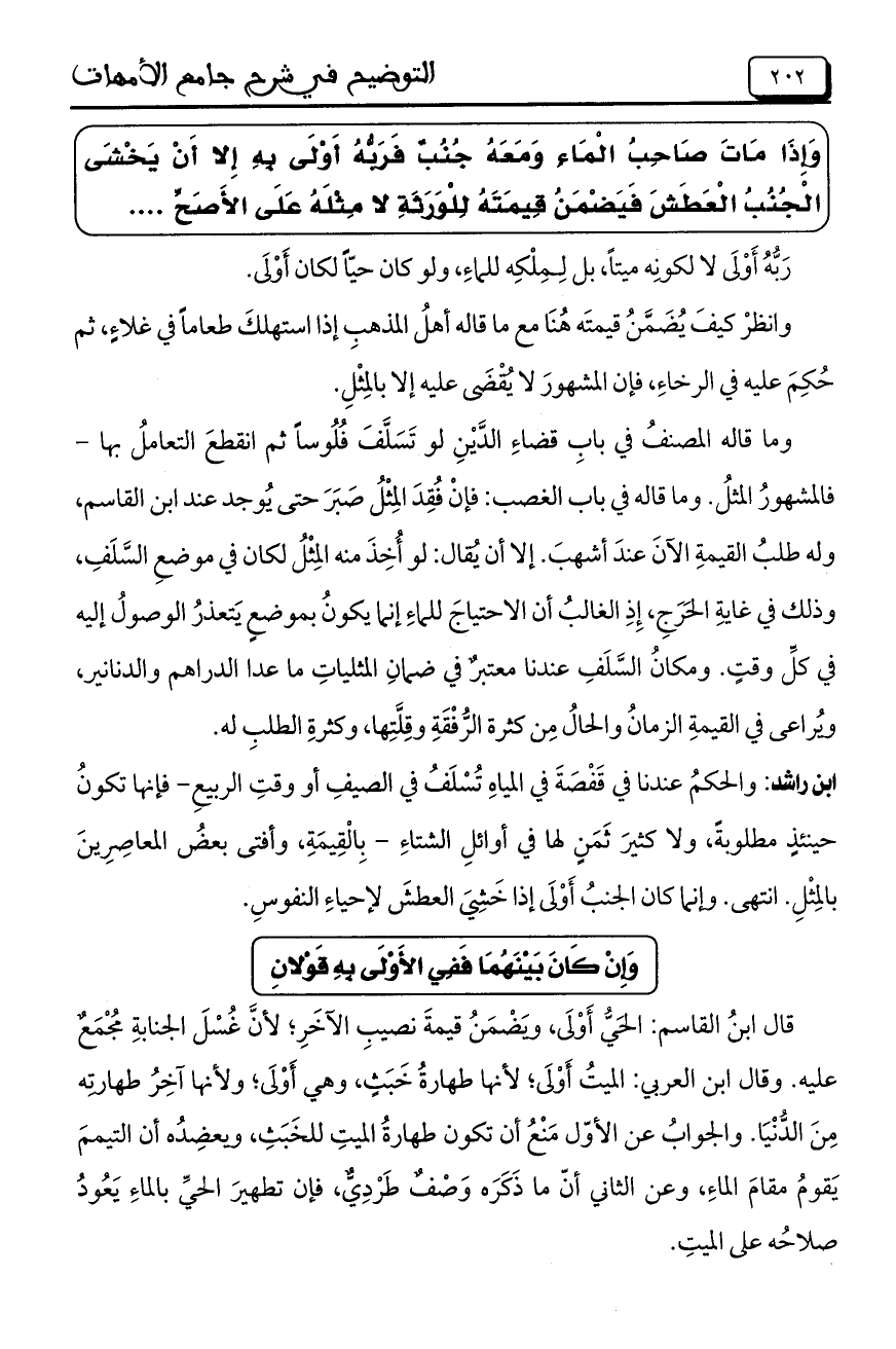 ابن راشد: والحكمُ عندنا في قَفْصَةَ في المياهِ تُسْلَفُ في الصيفِ أو وقتِ الربيعِ- فإنها تكونُ حينئذٍ مطلوبةً، ولا كثيرَ ثَمَنٍ لها في أوائلِ الشتاءِ– بِالْقِيمَةِ، وأفتى بعضُ المعاصِرِينَ بالمِثْلِ. انتهى. وإنما كان الجنبُ أَوْلَى إذا خَشِيَ العطشَ لإحياءِ النفوسِ.