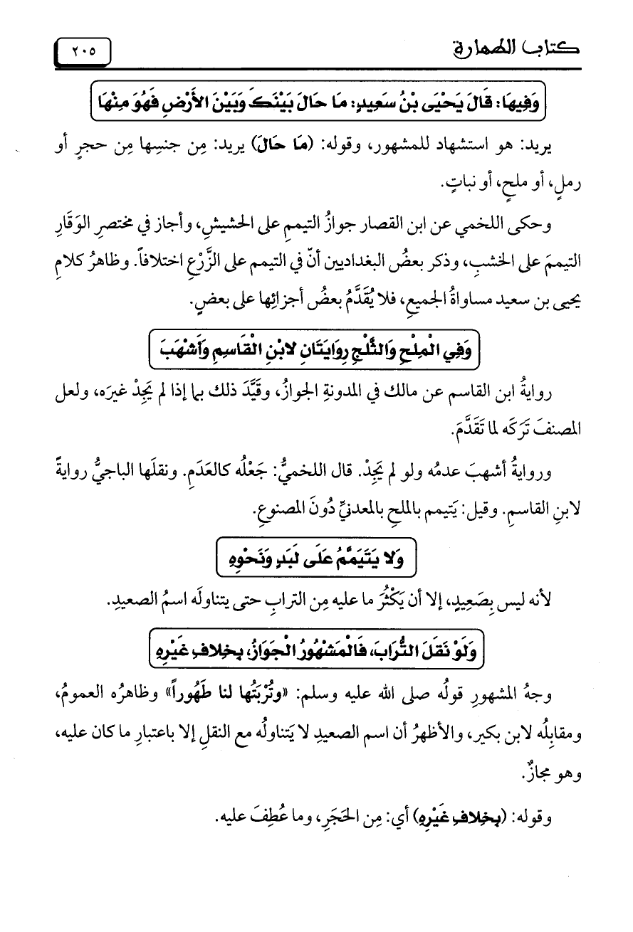 وحكى اللخمي عن ابن القصار جوازُ التيممِ على الحشيشِ، وأجاز في مختصرِ الوَقَارِ التيممَ على الخشبِ، وذكر بعضُ البغداديين أنّ في التيمم على الزَّرْعِ اختلافاً. وظاهرُ كلامِ يحيى بن سعيد مساواةُ الجميعِ، فلا يُقَدَّمُ بعضُ أجزائِها على بعضٍ.