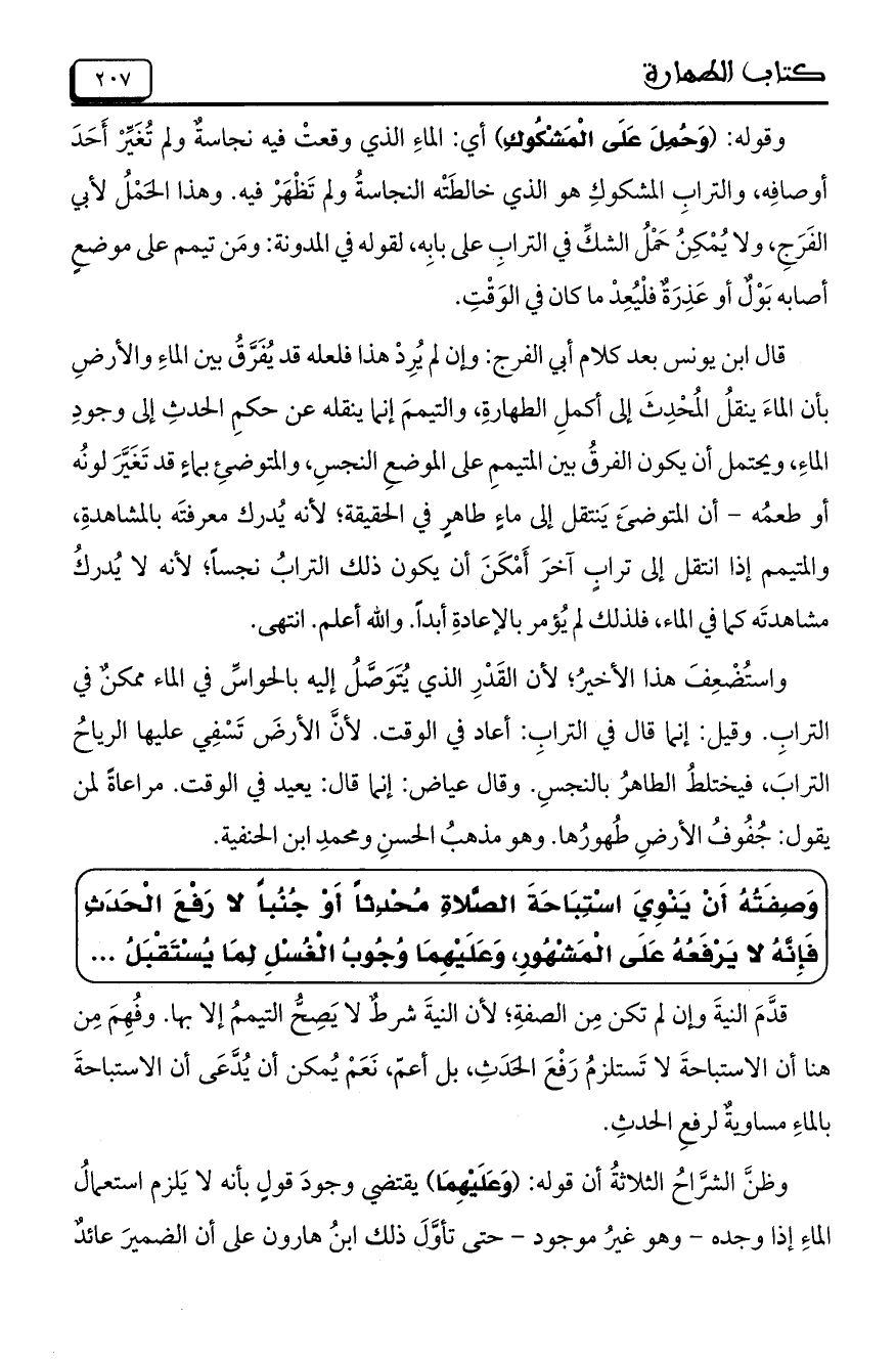 وقوله: (وَحُمِلَ عَلَى الْمَشْكُوكِ) أي: الماءِ الذي وقعتْ فيه نجاسةٌ ولم تُغَيِّرْ أَحَدَ أوصافِه، والترابِ المشكوكِ هو الذي خالطَتْه النجاسةُ ولم تَظْهَرْ فيه. وهذا الحَمْلُ لأبي الفَرَجِ، ولا يُمْكِنُ حَمْلُ الشكِّ في الترابِ على بِابِه، لقوله في المدونة: ومَن تيمم على موضعٍ أصابه بَوْلٌ أو عَذِرَةٌ فلْيُعِدْ ما كان في الوَقْتِ.