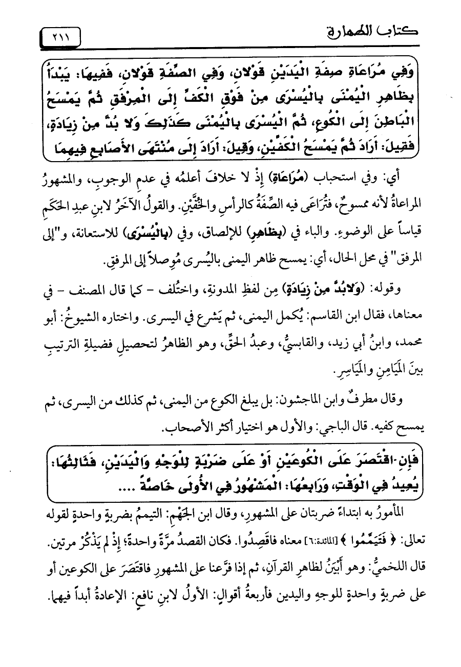 وقال مطرفٌ وابن الماجشون: بل يبلغ الكوع من اليمنى، ثم كذلك من اليسرى، ثم يمسح كفيه. قال الباجي: والأول هو اختيار أكثر الأصحاب.