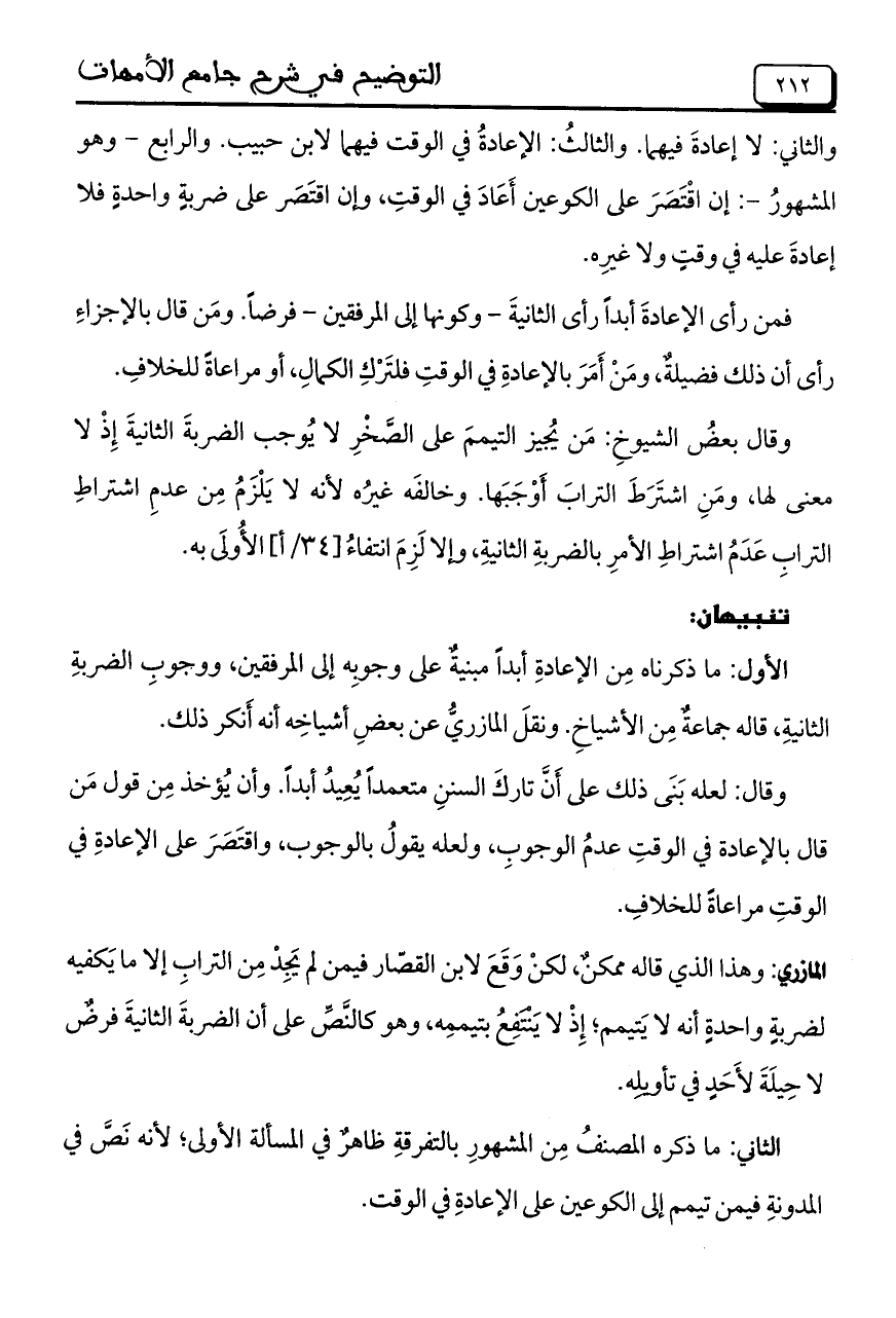 الأول: ما ذكرناه مِن الإعادةِ أبداً مبنيةٌ على وجوبِه إلى المرفقين، ووجوبِ الضربةِ الثانيةِ، قاله جماعةٌ مِن الأشياخِ. ونقلَ المازريُّ عن بعضِ أشياخِه أنه أَنكر ذلك.