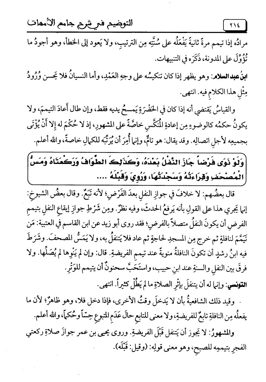 قال بعضُهم: لا خلافَ في جوازِ النفلِ بعدَ الفَرْضِ؛ لأنه تَبَعٌ. وقال بعضُ الشيوخِ: إنما يَجري هذا على القولِ بأنه يَرفعُ الحدثَ، وفيه نظرٌ. ومِن شَرْطِ جوازِ إيقاعِ النفلِ بتيممِ الفرضِ أن يكونَ النفلُ متصلاً بالفرضِ؛ فقد روى أبو زيد عن ابن القاسم في العتبية: مَن تَيَمَّمَ لنافلةٍ ثم خرج مِن المسجدِ لحاجةٍ ثم عاد فلا يَتنفلُ به، ولا يَمَسُّ المصحفَ. وشَرَطَ فيه ابنُ رشدٍ أن تكونَ النافلةُ منويةً عند تيممِ الفريضةِ. قال: وإن لم يَنْوِها لم يُصَلِّها. ولا فرقَ بين النفلِ والسنةِ عند ابنِ حبيب، واستَحَبَّ سحنونٌ أن يتيمم للوَتْرِ.