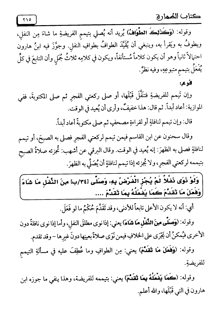 وقوله: (وَكَذَلِكَ الطَّوَافُ) يُريد أنه يُصلي بتيممِ الفريضةِ ما شاءَ مِن النفلِ، ويطوفُ به ويَقرأ به، وينبغي أن يُقَيَّدَ الطوافُ بطوافِ النفلِ. وجوَّزَ فيه ابنُ هارون احتمالاً ثانياً وهو أن يكون كلاماً مُستأنفاً، ويكون في كلامِه ثلاثُ جُمَلٍ وأن التابعَ في كلٍّ يُفْعَلُ بتيممِ متبوعِهِ، وفيه نظرٌ.