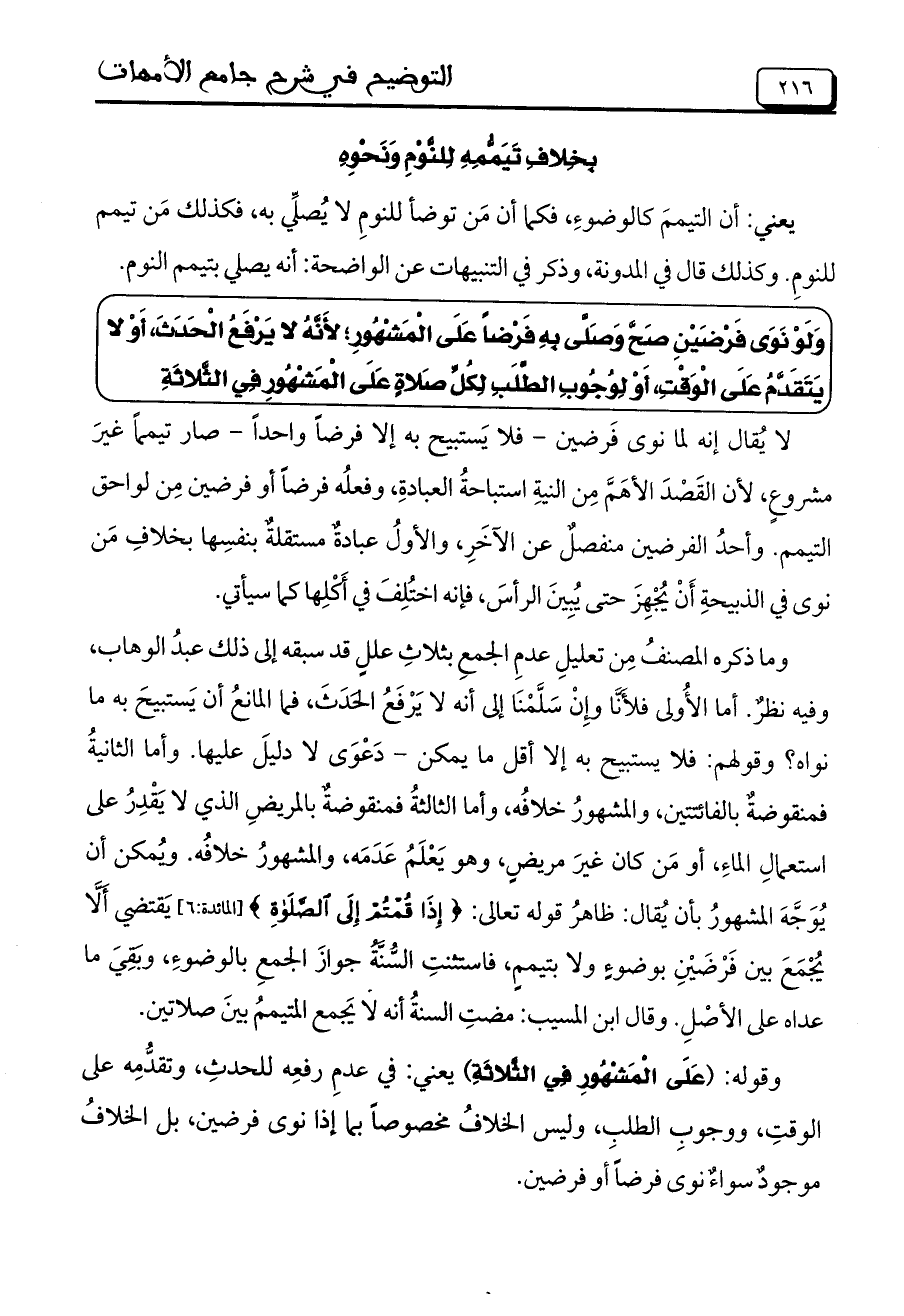 لا يُقال إنه لما نَوَى فَرضين– فلا يَستبيح به إلا فرضاً واحداً– صار تيمماً غيرَ مشروعٍ، لأن القَصْدَ الأهَمَّ مِن النيةِ استباحةُ العبادةِ، وفعلُه فرضاً أو فرضين مِن لواحق التيمم. وأحدُ الفرضين منفصلٌ عن الآخَرِ، والأولُ عبادةٌ مستقلةٌ بنفسِها بخلافِ مَن نَوَى في الذبيحةِ أَنْ يُجْهِزَ حتى يُبِينَ الرأسَ، فإنه اختُلِفَ في أَكْلِها كما سيأتي.
