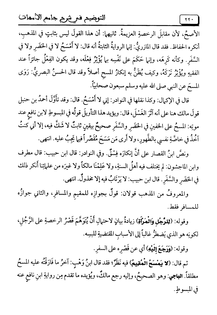 ثم قال: (لا يَمْسَحُ الْمُقِيمُ) فيه نظر؛ فقد قال ابن وهب: آخر ما فارقته عليه المسح مطلقاً. الباجي: وهو الصحيح، وإليه رجع مالك، ويؤيده ما تقدم من رواية ابن نافع عنه في المبسوط.