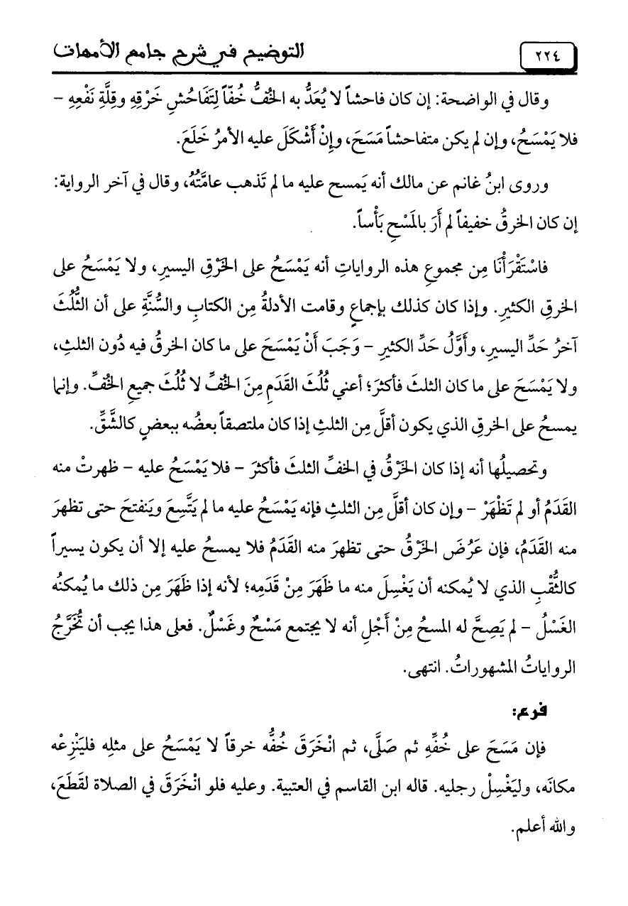 وتحصيلُها أنه إذا كان الخَرْقُ في الخفِّ الثلثَ فأكثرَ- فلا يَمْسَحُ عليه- ظهرتْ منه القَدَمُ أولم تَظْهَرْ- وإن كان أقلَّ مِن الثلثِ فإنه يَمْسَحُ عليه ما لم يَتَّسِعَ ويَنفتحَ حتى تظهرَ منه القَدَمُ، فإن عَرُضَ الخَرْقُ حتى تظهرَ منه القَدَمُ فلا يمسحُ عليه إلا أن يكون يسيراً كالثُّقْبِ الذي لا يُمكنه أن يَغْسِلَ منه ما ظَهَرَ مِنْ قَدَمِه؛ لأنه إذا ظَهَرَ مِن ذلك ما يُمكنُه الغَسْلُ- لم يَصِحَّ له المسحُ مِنْ أَجْلِ أنه لا يجتمع مَسْحٌ وغَسْلٌ. فعلى هذا يجب أن تُخَرَّجُ الرواياتُ الْمَشْهُورِاتُ. انتهى.