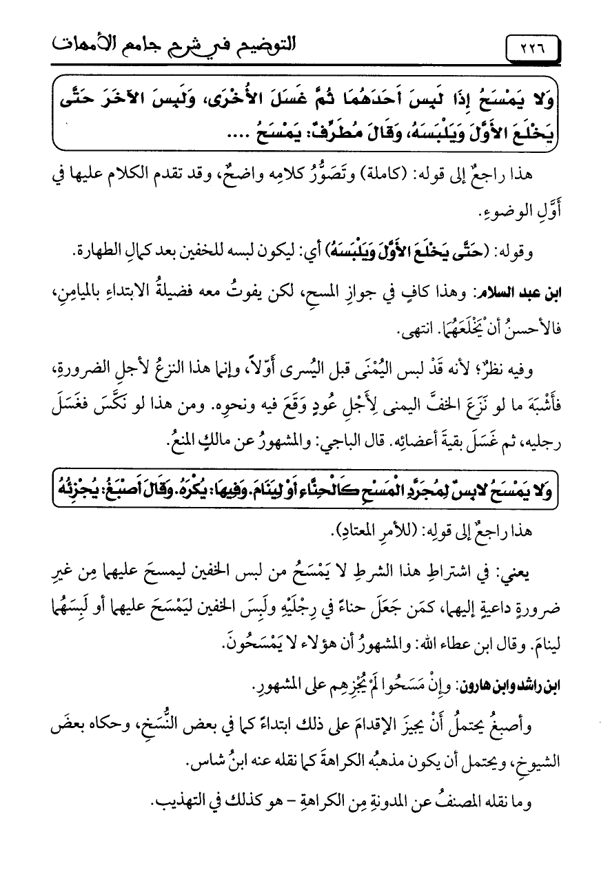 ابن عبد السلام: وهذا كافٍ في جوازِ المسحِ، لكن يفوتُ معه فضيلةُ الابتداءِ بالميامِن، فالأحسنُ أن يَخْلَعَهُمَا. انتهى.