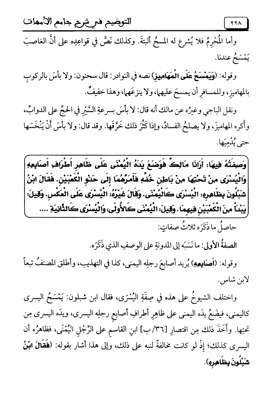 واختلف الشيوخُ على هذه في صِفَةِ اليُسْرَى، فقال ابن شبلون: يَمْسَحُ اليسرى كاليمنى، فيضَعُ يدَه اليمنى على ظاهِرِ أطرافِ أصابعِ رجلِه اليسرى، ويدَه اليسرى مِن تحتِها. وأَخَذَ ذلك مِن اقتصارِ [36/ ب] ابنِ القاسمِ على الرِّجْلِ اليُمْنَى، فظاهرُه أن اليسرى كذلك؛ إِذْ لو كانت مخالفةً لنبه على ذلك، وإلى هذا أشار بقوله: (فَقَالَ ابْنُ شَبْلُوَن بِظَاهِرِهِ).