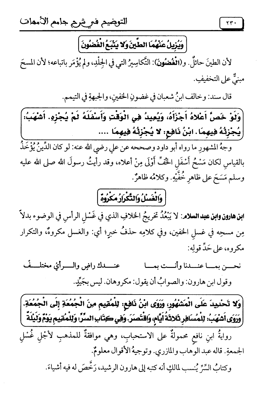 ابن هارون وابن عبد السلام: لا يَبْعُدُ تخريجُ الخلافِ الذي في غَسْلِ الرأسِ في الوضوء بدلاً مِن مسحِه في غسلِ الخفين، وفي كلامهِ حذفُ خبرٍ؛ أي: والغسل مكروهٌ، والتكرار مكروه، على حَدِّ قولِه: