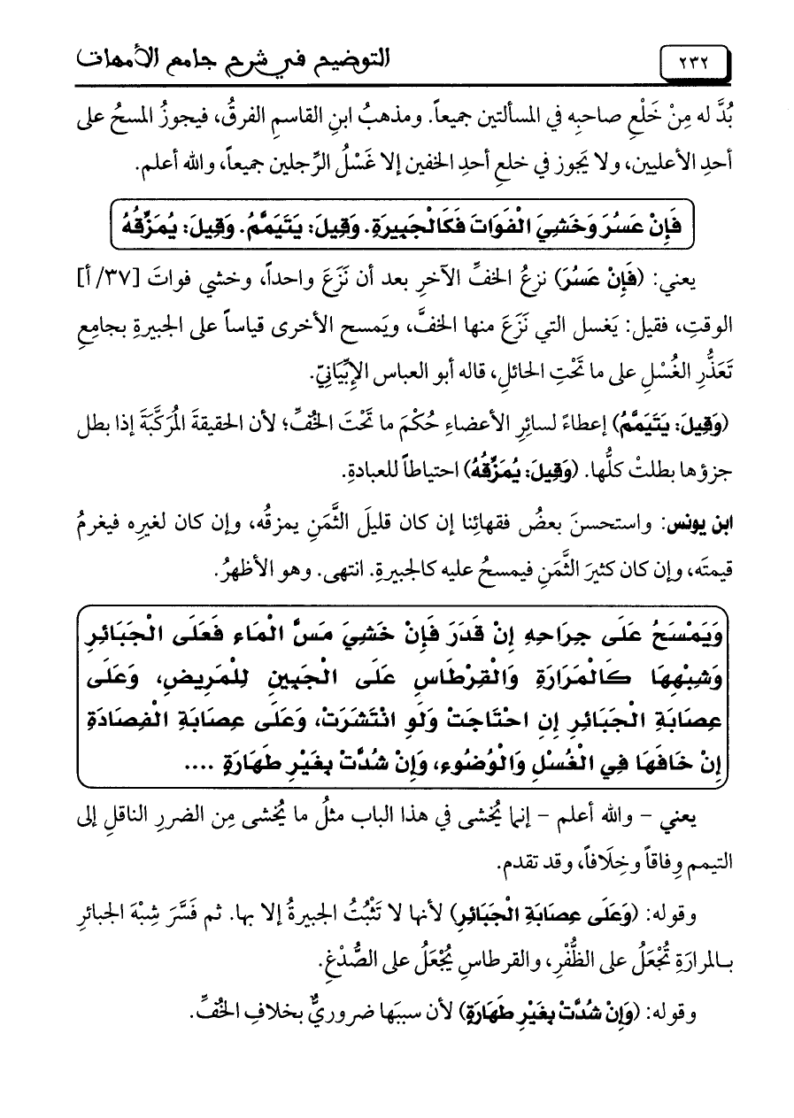 ابن يونس: واستحسنَ بعضُ فقهائِنا إن كان قليلَ الثَّمَنِ يمزقُه، وإن كان لغيرِه فيغرمُ قيمتَه، وإن كان كثيرَ الثَّمَنِ فيمسحُ عليه كالجبيرةِ. انتهى. وهو الأظهرُ.