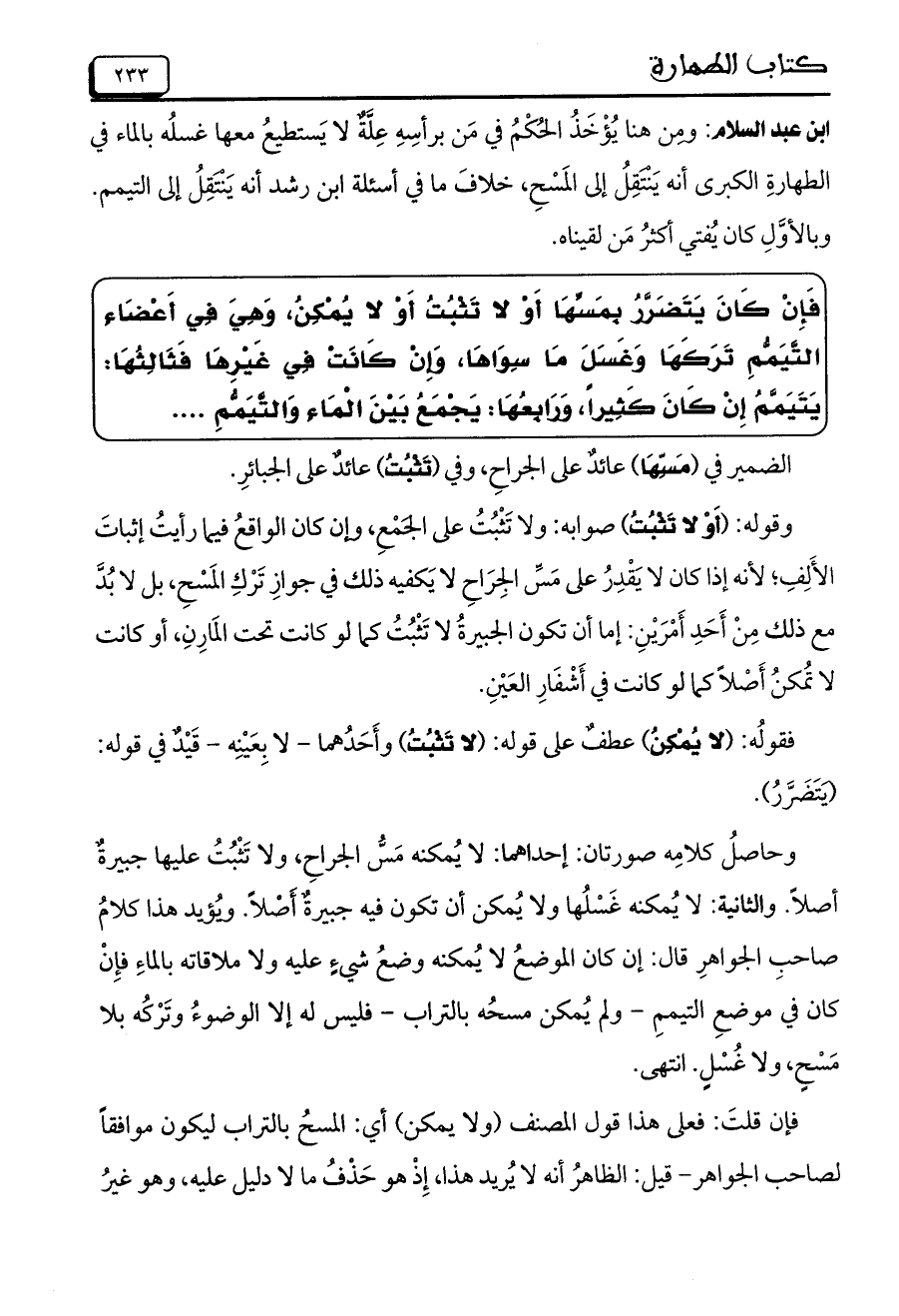 ابن عبد السلام: ومِن هنا يُؤْخَذُ الحُكْمُ في مَن برأسِهِ عِلَّةٌ لا يَستطيعُ معها غسلُه بالماء في الطهارةِ الكبرى أنه يَنْتَقِلُ إلى المَسْحِ، خلافَ ما في أسئلة ابن رشد أنه يَنْتَقِلُ إلى التيمم. وبالأوَّلِ كان يُفتي أكثرُ مَن لقيناه.