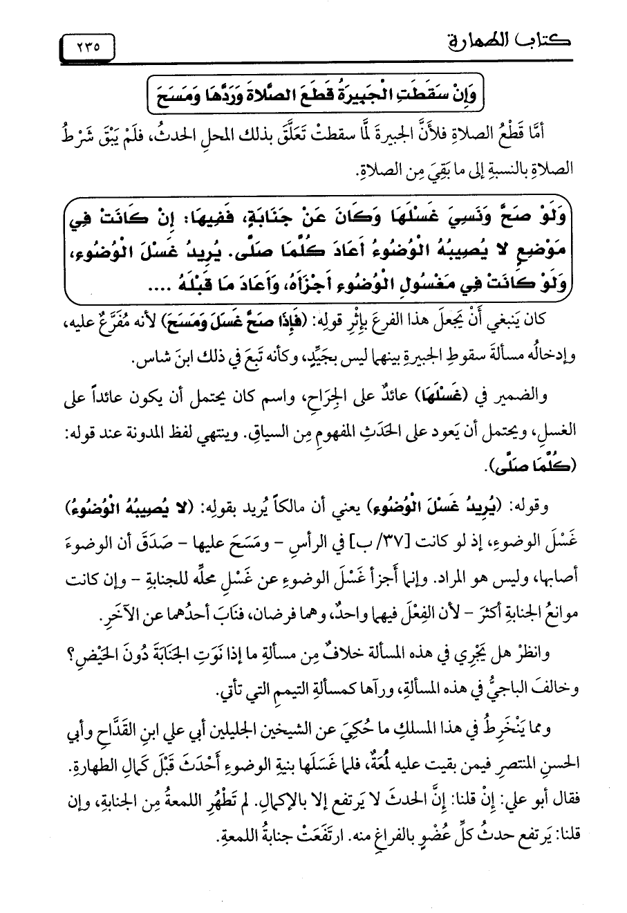 ومما يَنْخَرِطُ في هذا المسلكِ ما حُكِيَ عن الشيخين الجليلين أبي علي ابنِ القَدَّاحِ وأبي الحسنِ المنتصرِ فيمن بقيت عليه لمُعَةٌ، فلما غَسَلَها بنيةِ الوضوءِ أَحْدَثَ قَبْلَ كَمالِ الطهارةِ. فقال أبو علي: إِنْ قلنا: إِنَّ الحدثَ لا يَرتفع إلا بالإكمالِ. لم تَطْهُرِ اللمعةُ مِن الجنابةِ، وإن قلنا: يَرتفع حدثُ كلِّ عُضْوٍ بالفراغِ منه. ارتَفَعَتْ جنابةُ اللمعةِ.