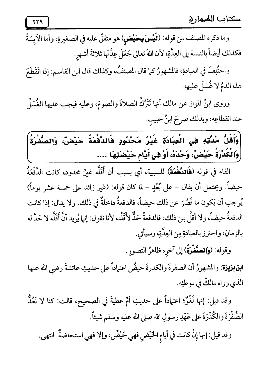 ابن بزيزة: والْمَشْهُورِ أن الصفرةَ والكدرةَ حيضٌ اعتماداً على حديثِ عائشةَ رضي الله عنها الذي رواه مالكٌ في موطئِه.