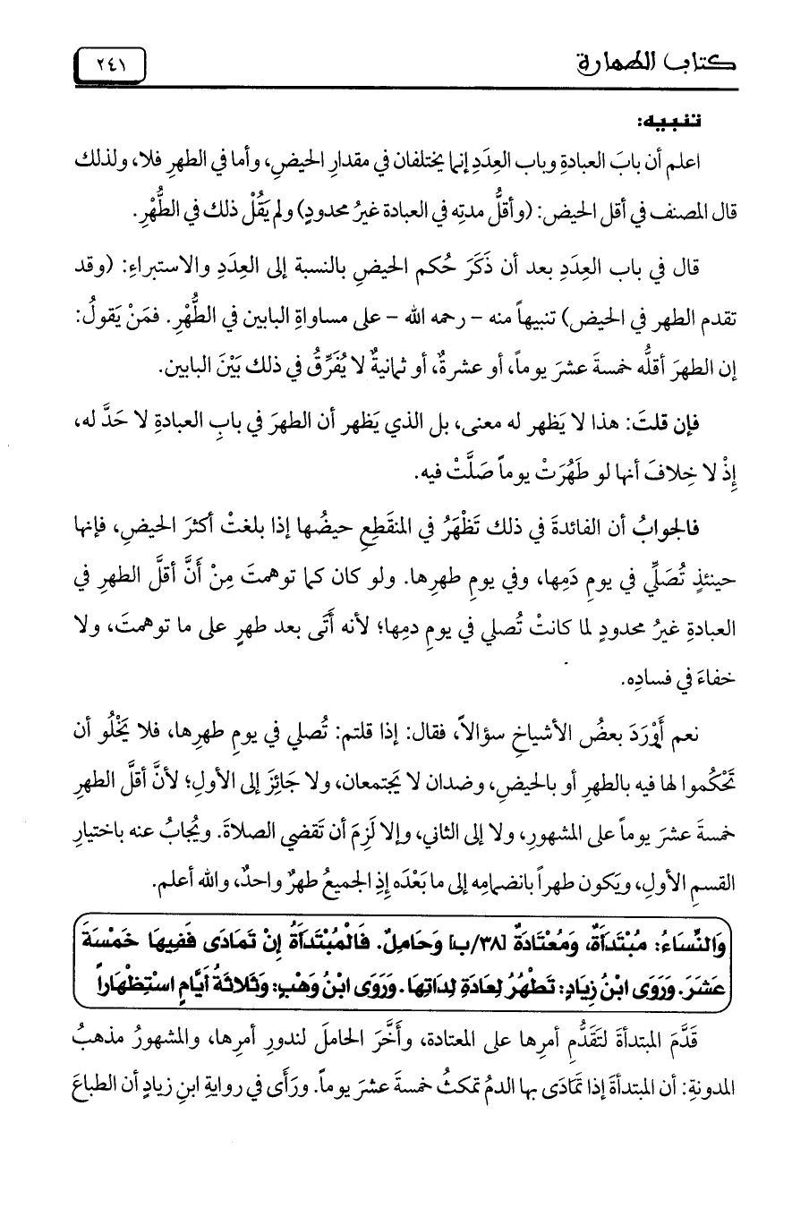 قَدَّم المبتدأةَ لتَقَدُّمِ أمرِها على المعتادة، وأَخَّرَ الحاملَ لندورِ أمرِها، والْمَشْهُورِ مذهبُ المدونةِ: أن المبتدأة إذا تَمَادَى بها الدمُ تمكثُ خمسةَ عشرَ يوماً. ورَأَى في روايةِ ابنِ زيادٍ أن الطباعَ