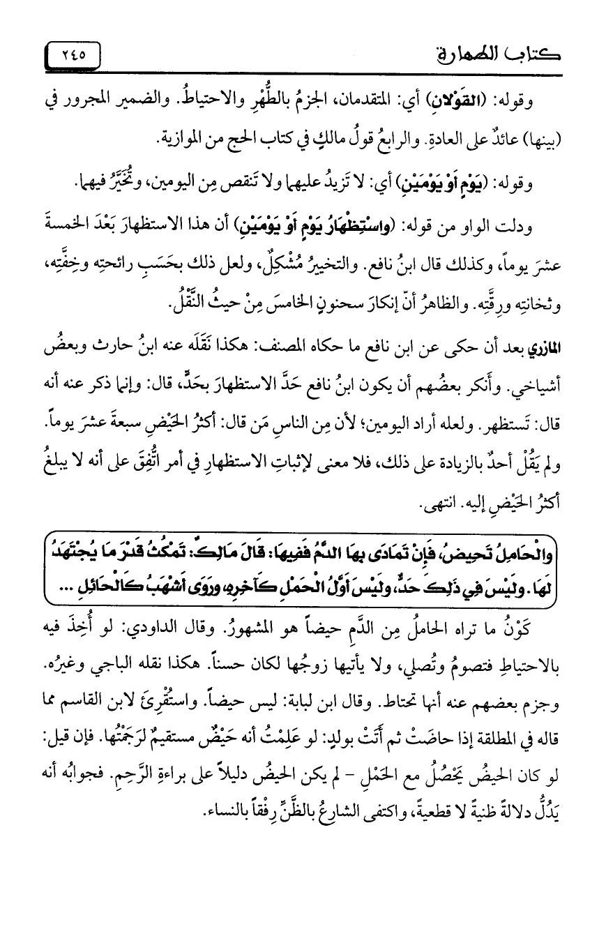 المازري بعد أن حكى عن ابن نافع ما حكاه المصنف: هكذا نَقَلَه عنه ابنُ حارث وبعضُ أشياخي. وأنكر بعضُهم أن يكون ابنُ نافع حَدَّ الاستظهارَ بحَدٍّ، قال: وإنما ذكر عنه أنه قال: تَستظهر. ولعله أراد اليومين؛ لأن مِن الناسِ مَن قال: أكثرُ الحَيْضِ سبعةَ عشرَ يومًا. ولم يَقُلْ أحدٌ بالزيادة على ذلك، فلا معنى لإثباتِ الاستظهارِ في أمر اتُّفِقَ على أنه لا يبلغُ أكثرُ الحَيْضِ إليه. انتهى.