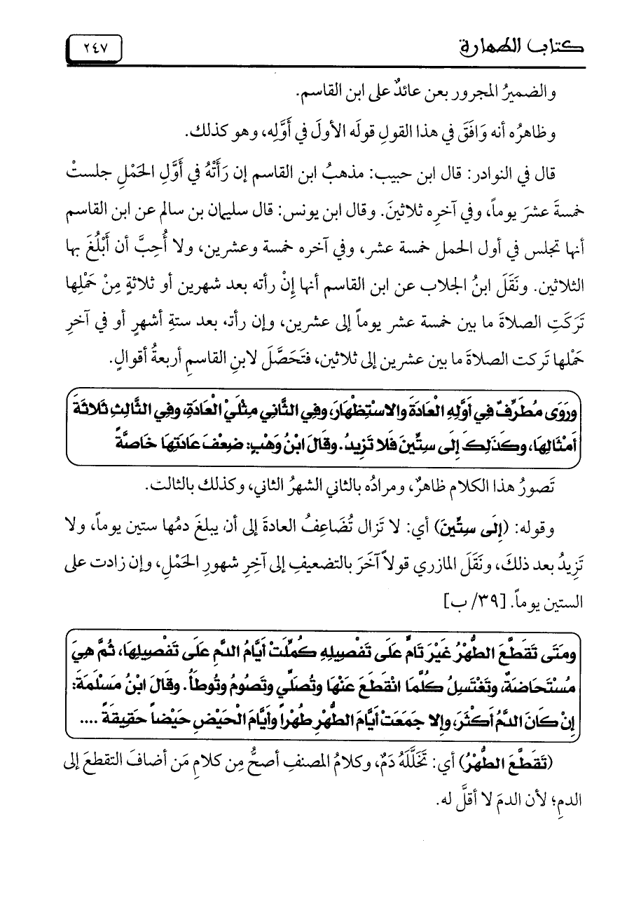 ومَتَى تَقَطَّعَ الطُّهْرُ غَيْرَ تَامٍّ عَلَى تَفْصِيلِهِ كُمِّلَتْ أَيَّامُ الدَّمِ عَلَى تَفْصِيلِهَا، ثُمَّ هِيَ مُسْتَحَاضَةٌ، وتَغْتَسِلُ كُلَّمَا انْقَطَعَ عَنْهَا وتُصَلِّي وتَصُومُ وتُوطَأُ. وقَالَ ابْنُ مَسْلَمَةَ: إِنْ كَانَ الدَّمُ أَكْثَرَ وإِلا جَمَعَتْ أَيَّامَ الطُّهْرِ طُهْراً وأَيَّامَ الْحَيْضِ حَيْضاً حَقِيقَةً ....