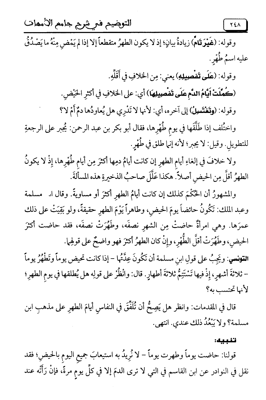 قولنا: حاضت يومًا وطهرت يومًا- لا نُرِيدُ به استيعابَ جميعٍ اليومِ بالحيضِ؛ فقد نقل في النوادر عن ابن القاسم في التي لا ترى الدمَ إلا في كلِّ يومٍ مرةً، فإنْ رَأَتْه عند