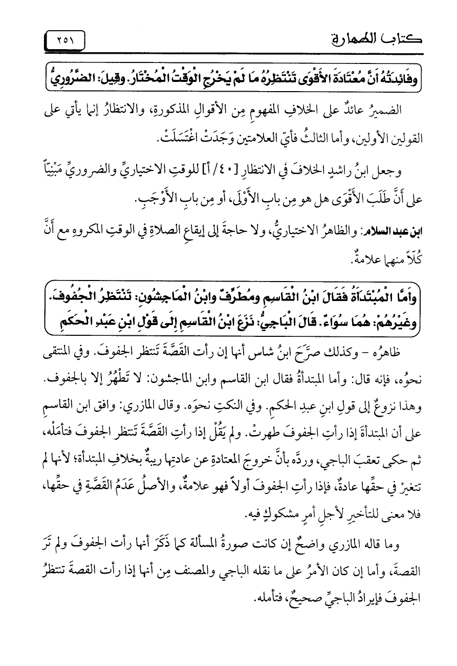 ظاهرُه– وكذلك صرَّحَ ابنُ شاس أنها إن رأت القَصَّةَ تَنتظر الجفوفَ. وفي المنتقى نحوُه، فإنه قال: وأما المبتدأةُ فقال ابن القاسم وابن الماجشون: لا تَطْهُرُ إلا بالجفوف. وهذا نزوعٌ إلى قولِ ابنِ عبدِ الحكمِ. وفي النكتِ نحوَه. وقال المازري: وافق ابن القاسمِ على أن المبتدأةَ إذا رأتِ الجفوفَ طهرتْ. ولم يَقُلْ إذا رأتِ القَصَّةَ تَنتظر الجفوفُ فتأمَله، ثم حكى تعقبَ الباجي، وردَّه بأنَّ خروجَ المعتادةِ عن عادتِها ريبةٌ بخلافِ المبتدأة؛ لأنها لم تتغيرْ في حقِّها عادةٌ، فإذا رأتِ الجفوفَ أولاً فهو علامةٌ، والأصلُ عَدَمُ القَصَّةِ في حقِّها، فلا معنى للتأخيرِ لأجلِ أمرٍ مشكوكٍ فيه.