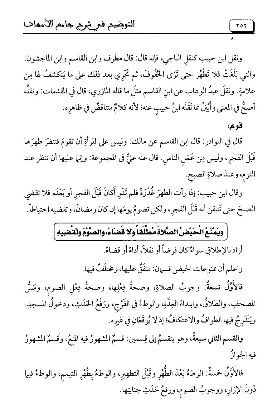 ونقلُ ابن حبيب كنقلِ الباجي، فإنه قال: قال مطرف وابن القاسم وابن الماجشون: والتي بَلَغَتْ فلا تَطْهُر حتى تَرَى الجُفُوفَ، ثم تَجْرِي بعد ذلك على ما يَنكشفُ لها مِن علامةٍ. ونقلَ عبدُ الوهاب عن ابنِ القاسم مثلَ ما قاله المازري، قال في المقدمات: ونقلُه أصحُّ في المعنى وأَبْيَنُ مما نَقَلَه ابنُ حبيبٍ عنه؛ لأنه كلامٌ متناقضٌ في ظاهرِه.