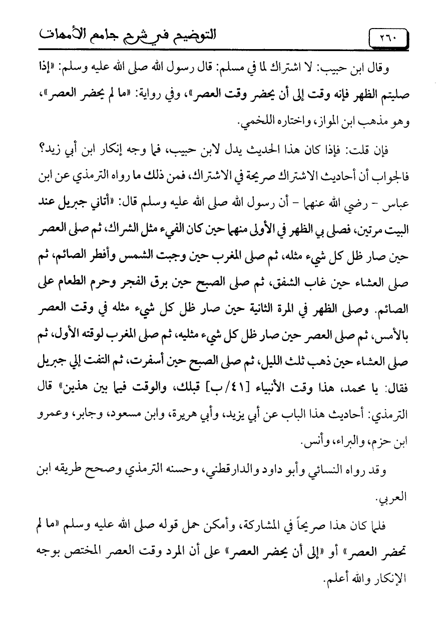 فإن قلت: فإذا كان هذا الحديث يدل لابن حبيب، فما وجه إنكار ابن أبي زيد؟ فالجواب أن أحاديث الاشتراك صريحة في الاشتراك، فمن ذلك ما رواه الترمذي عن ابن عباس – رضي الله عنهما – أن رسول الله صلى الله عليه وسلم قال: ((أتاني جبريل عند البيت مرتين، فصلى بي الظهر في الأولى منهما حين كان الفيء مثل الشراك، ثم صلى العصر حين صار ظل كل شيء مثله، ثم صىل المغرب حين وجبت الشمس وأفطر الصائم، ثم صلى العشاء حين غاب الشفق، ثم صلى الصبح حين برق الفجر وحرم الطعام على الصائم. وصلى الظهر في المرة الثانية حين صار ظل كل شيء في وقت العصر بالأمس، ثم صلى العصر حين صار ظل كل شيء مثليه، ثم صلى المغرب لوقته الأول، ثم صلى العشاء حين ذهب ثلث الليل، ثم صلى الصبح حين أسفرت، ثم التفت إلى جبريل فقال: يا محمد، هذا وقت الأنبياء [41/ ب] قبلك، والوقت فيما بين هذين)) قال الترمذي: أحاديث هذا الباب عن أبي يزيد، وأبي هريرة، وابن مسعود، وجابر، وعمرو ابن حزم، والبراء، وأنس.