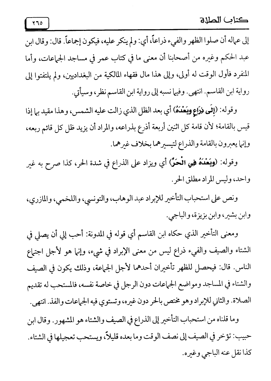 ومعنى التأخير الذي حكاه ابن القاسم أي قوله في المدونة: أحب إلي أن يصلي في الشتاء والصيف والفيء ذراع ليس من معني الإبراد في شيء، وإنما هو لأجل اجتماع الناس. قال: فيحصل للظهر تأخيران أحدهما لأجل الجماعة، وذلك يكون في الصيف والشتاء في المساجد ومواضع الجماعات دون الرجل في خاصة نفسه، فالمستحب له تقديم الصلاة. والثاني للإبراد وهو مختص بالحر دون غيره، وتستوي فيه الجماعات والفذ. انتهى.