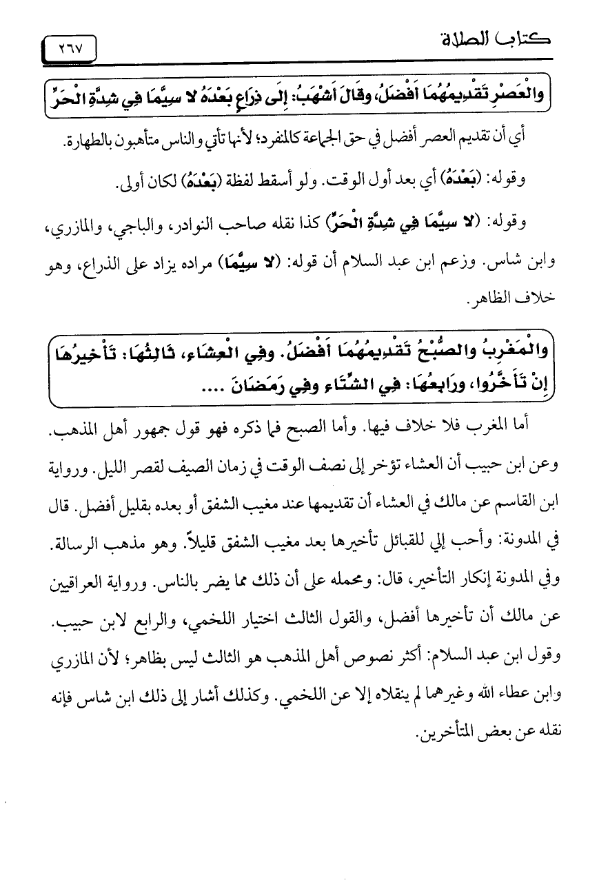وفي المدونة إنكار التأخير، قال: ومحمله على أن ذلك مما يضر بالناس. ورواية العراقيين عن مالك أن تأخيرها أفضل، والقول الثالث اختبار اللخمي، والرابع لابن حبيب. وقول ابن عبد السلام: أكثر نصوص أهل المذهب هو الثالث ليس بظاهر؛ لأن المازري وابن عطاء الله وغيرهما لم ينقلاه إلا عن اللخمي. وكذلك أشار إلى ذلك ابن شاس فإنه نقله عن بعض المتأخرين.