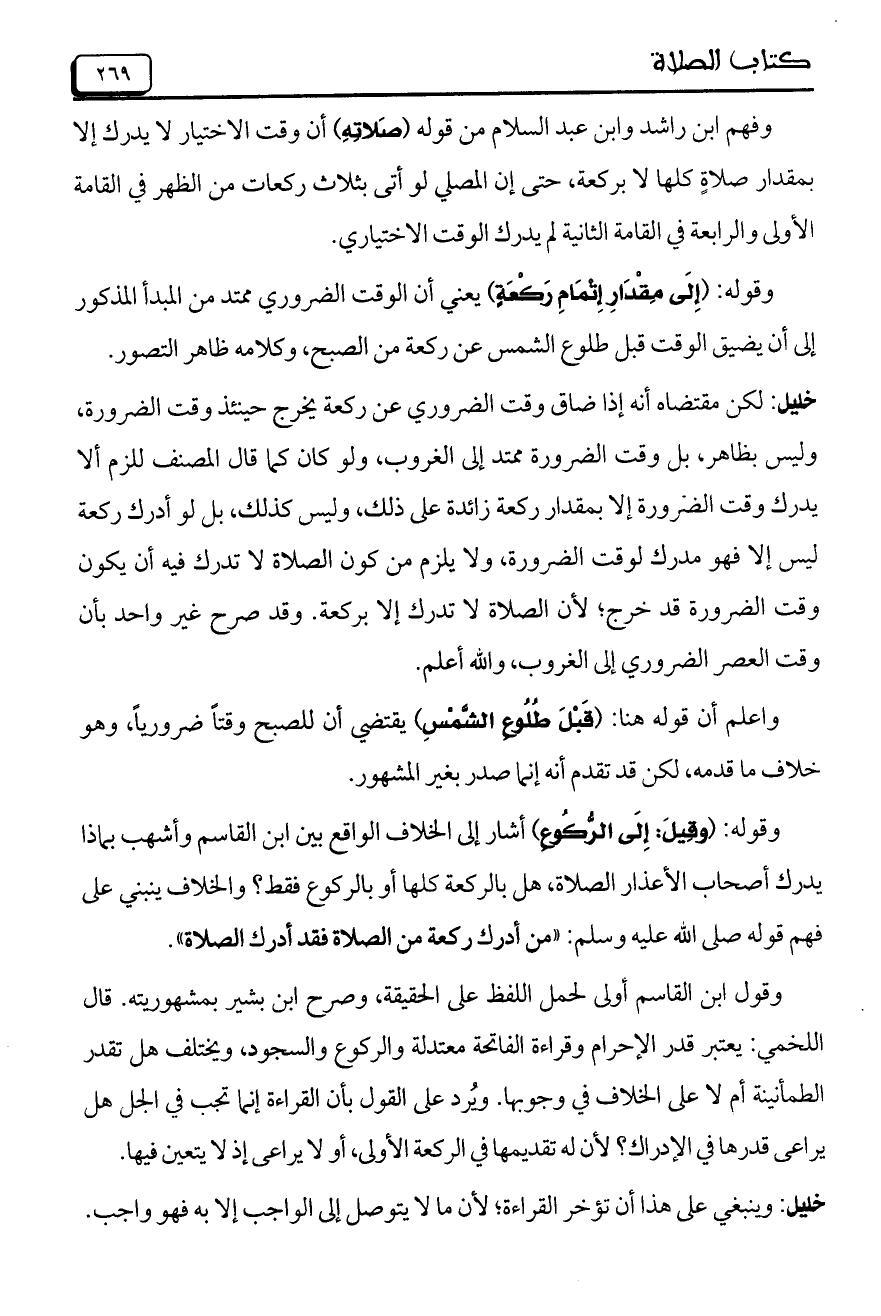 وفهم ابن راشد وابن عبد السلام من قوله (صَلاتِهِ) أن وقت الاختيار لا يدرك إلا بمقدار صلاة كلها لا بركعة، حتى إن المصلي لو أتى بثلاث ركعات من الظهر في القامة الأولي والرابعة في القامة الثانية لم يدرك الوقت الاختياري.