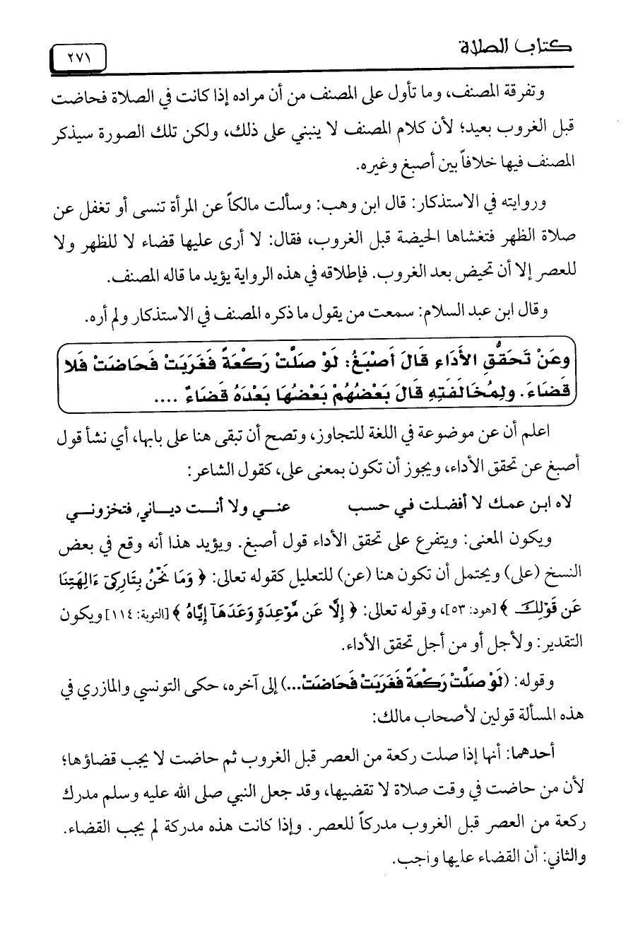 وَعَنْ تَحَقُّقَ الأَدَاءِ قَالَ أَصَبْغُ: لَوْ صَلْتْ رَكْعَةً فَغَرَبَتْ فَحَاضَتْ فَلا قَضَاءَ. وَلِمُخَالَفَتِهِ قَالَ بَعْضُهُمْ بَعْضُهَا بَعْدَهُ قَضَاءٌَ ......
