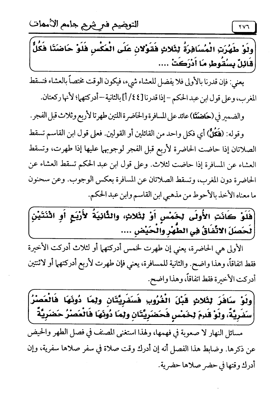 وَلَوْ طَهُرَتْ الْمُسَافِرَةُ لِثَلاثٍ فَقَوْلانِ عَلَى الْعَكْسِ فَلَوْ حَاضَتَا فَكُلٌّ قَائِلٌ بِسُقُوطِ مَا أَدْرَكَتْ ....