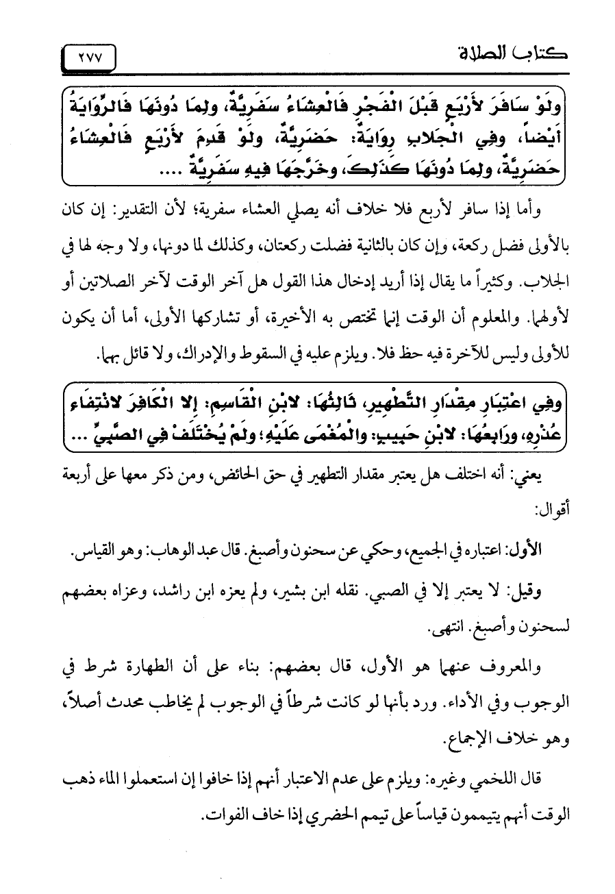 وَلَوْ سَافَرَ لأَرْبَعٍ قَبْلَ الْفَجْرِ فَالْعِشَاءُ سَفَرِيَّةٌ، ولِمَا دُونَهَا فَالرِّوَايَةُ أيضاً، وفِي الجَلابِ رِوَايَةٌ: حَضَرِيَّةٌ، وَلَوْ قَدِمَ لأَرْبَعٍ فَالْعِشَاءُ حَضَرِيّةٌ، وِلمَا دُونَهَا كَذَلِكَ، وَخَرَّجَهَا فِيهِ سَفَرِيّةٌ ....