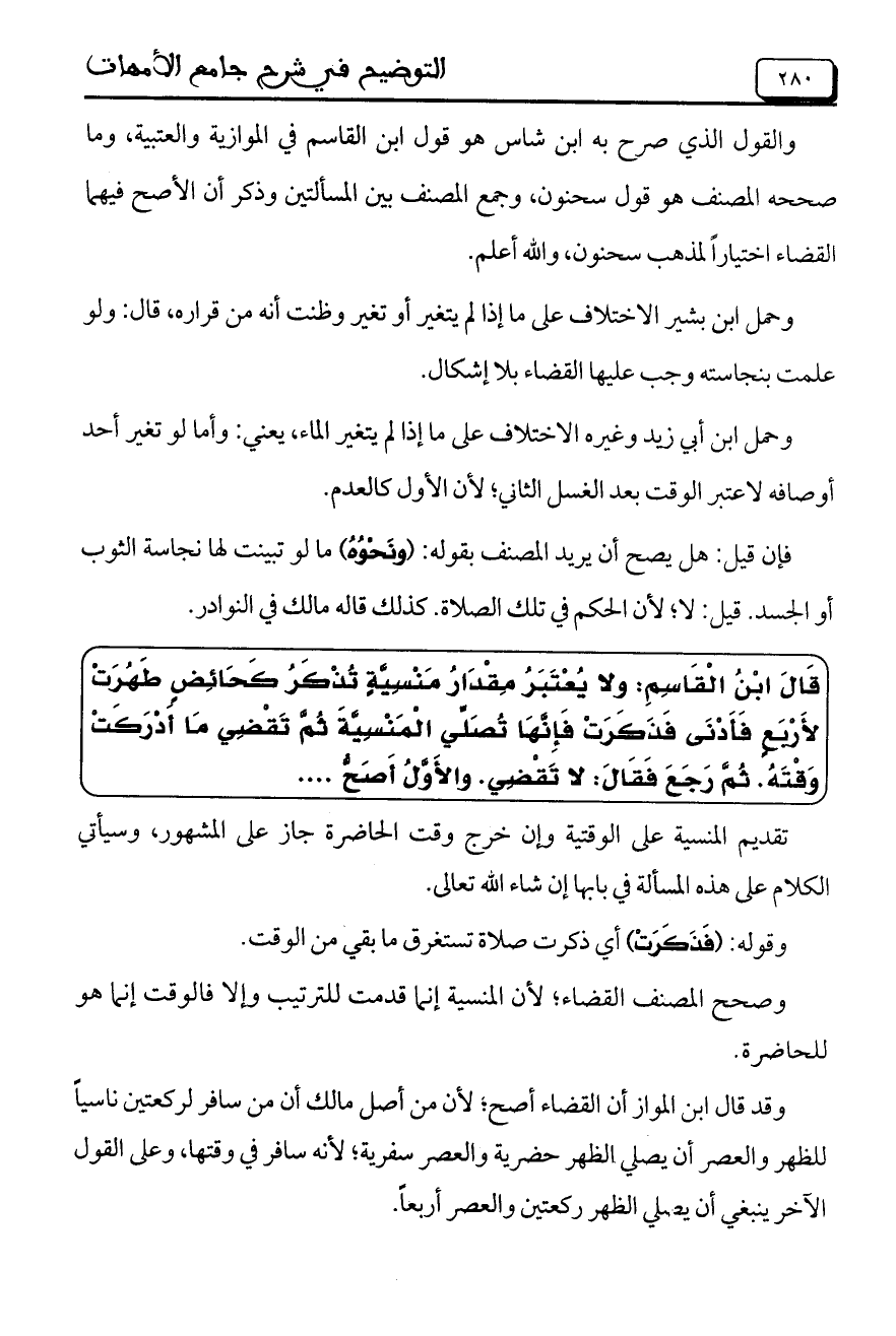 قَالَ اِبْنُ الْقَاسِمِ: ولا يُعْتَبَرُ مِقْدَارُ مَنْسِيَّةٍ تُذْكَرُ كَحَائِضٍ طَهُرَتْ لأَرْبَعٍ فَأَدْنَى فَذَكَرَتْ فَإِنَّهَا تُصْلِّي الْمَنْسِيَّةَ ثُمَّ تَقْضِي مَا أَدْرَكَتْ وَقْتَهُ. ثُمَّ رَجَعَ فَقَالَ: لا تَقَضِي. والأَوَّلُ أَصَحُّ ....