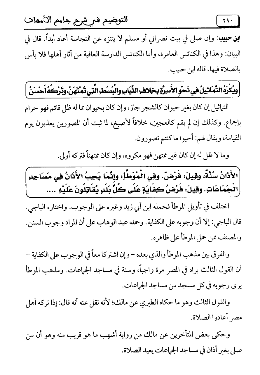 الأَذَانُ سُنَّةً، وقِيلَ: فَرْضٌ. وفِي الْمُوَطَّأِ: وإِنَّمَا يَجِبُ الأَذَانُ فِي مَسَاجِدِ الْجَمَاعَاتِ. وقِيلَ: فَرْضُ كِفَايَةٍ عَلَى كُلَّ بَلَدٍ يُقَاتِلُونَ عَلَيْهِ ....
