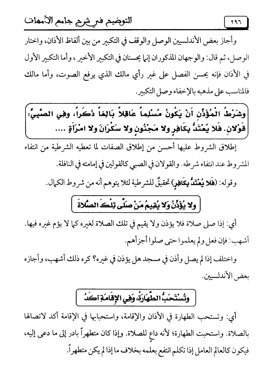 وشَرْطُ الْمُؤَذِّنِ أَنْ يَكُونُ مُسْلِماً عَاقِلاً بَالِغاً ذَكراً، وفِي الصَّبِّي: قَوْلانِ. فَلا يُعْتَدُّ بِكَافِرٍ ولا مَجْنُونٍ ولا سَكْرَانَ ولا امْرَأَةٍ ....
