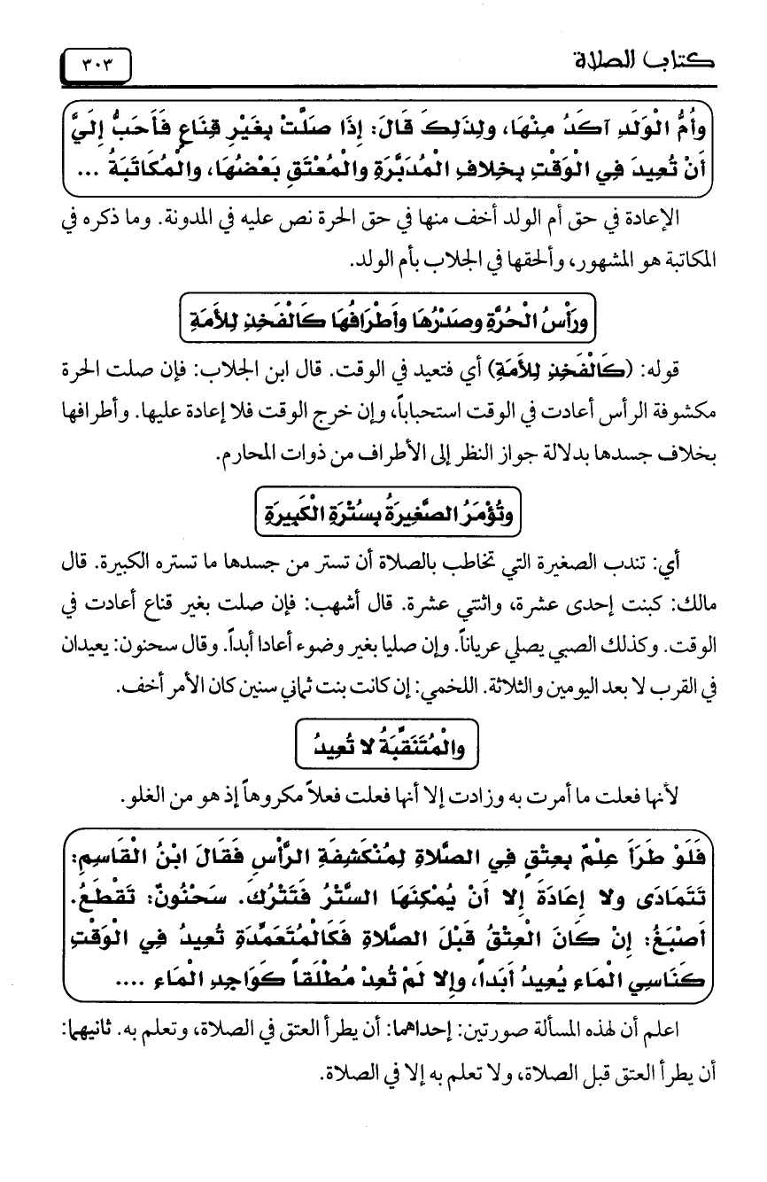 الإعادة في حق أم الولد أخف منها في حق الحرة نص عليه في المدونة. وما ذكره في المكاتبة هو الْمَشْهُورِ، وألحقها في الجلاب بأم الولد.