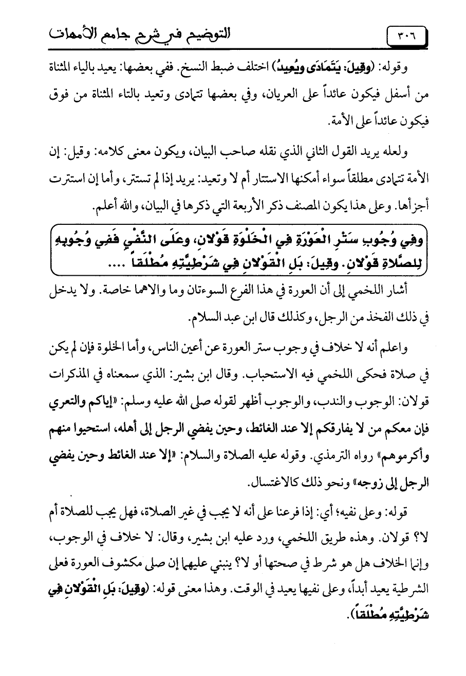 وأعلم أنه لا خلاف في وجوب ستر العورة عن أعين الناس، وأما الخلوة فإن لم يكن في صلاة فحكى اللخمي فيه الاستحباب. وقال ابن بشير: الذي سمعناه في المذكرات قولان: الوجوب والندب، والوجوب أظهر لقوله صلى الله عليه وسلم: "إياكم والتعري فإن معكم من لا يفارقكم إلا عند الغائط، وحين يقضي الرجل إلى أهله، استحيوا منهم وأكرموهم" رواه الترمذي، قوله عليه الصلاة والسلام: "إلا عند الغائط وحين يفضي الرجل إلى زوجه"، ونحو ذلك كالاغتسال.