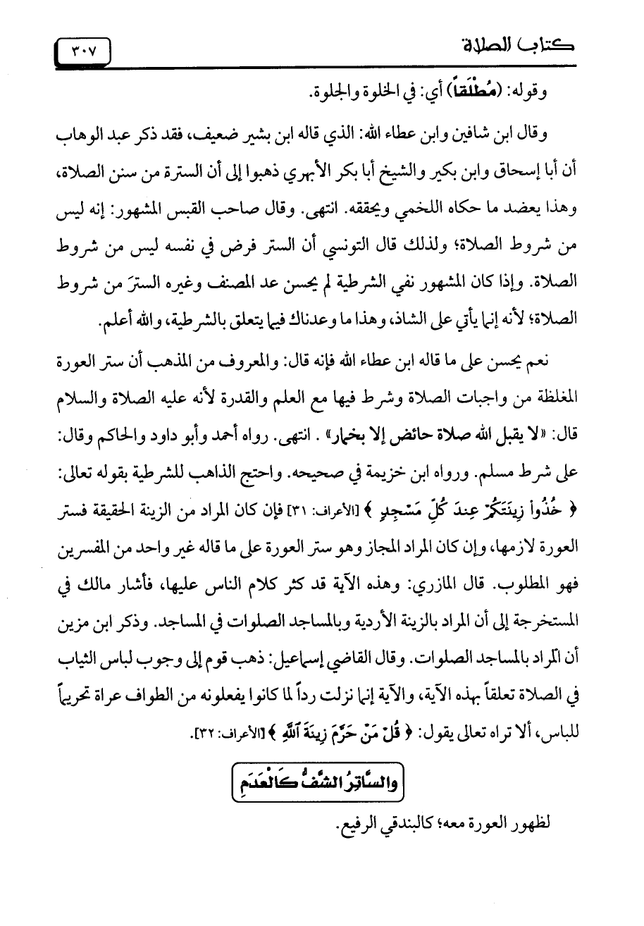 وقال ابن شافين وابن عطاء: الذي قاله ابن بشير ضعيف، فقد ذكر عبد الوهاب أن أبا إسحاق وابن بكير والشيخ أبا بكر الأبهري ذهبوا إلى أن السترة من سنن الصلاة، وهذا يعضد ما حكاه اللخمي ويحققه. انتهى. وقال صاحب القبس الْمَشْهُورِ: إنه ليس من شروط الصلاة؛ ولذلك قال التونسي أن الستر فرض في نفسه ليس من شروط الصلاة. وإذا كان الْمَشْهُورِ نفي الشرطية لم يحسن عد المصنف وغيره الستر من شروط الصلاة؛ لأنه إنما يأتي على الشاذ، وهذا ما وعدناك فيما يتعلق بالشرطية، والله أعلم.