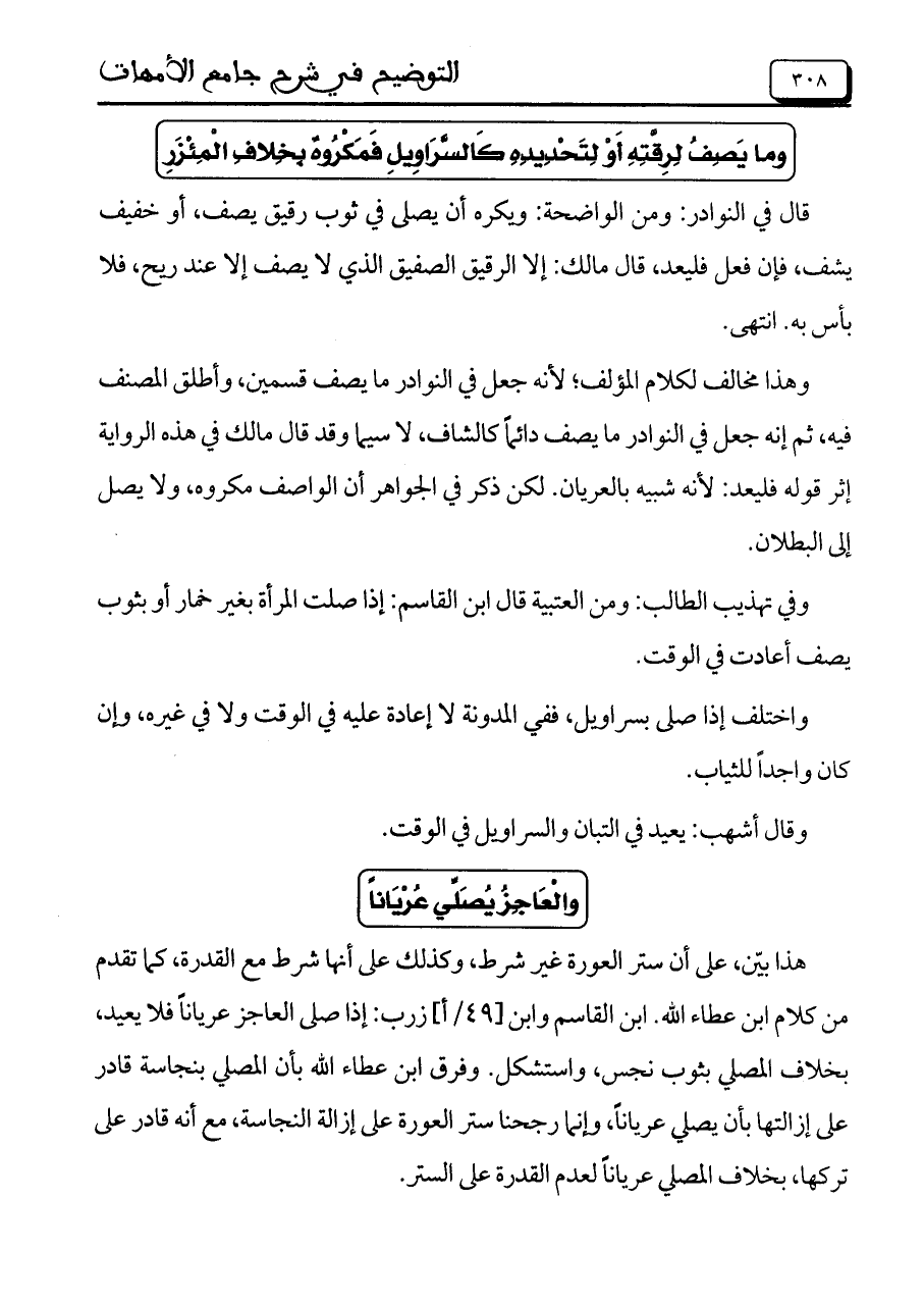 هذا بيّن، على أن ستر العورة غير شرط، وكذلك على أنها شرط مع القدرة، كما تقدم من كلام ابن عطاء الله. ابن القاسم وابن [49/أ] زرب: إذا صلى العاجز عرياناً فلا يُعيد، بخلاف المصلي بثوب نجس، واستشكل. وفرق ابن عطاء الله بأن المصلي بنجاسة قادر على إزالتها بأن يصلي عرياناً، وإنما رجحنا ستر العورة على إزالة النجاسة، مع أنه قادر على تركها، بخلاف المصلي عرياناً لعدم القدرة على الستر.