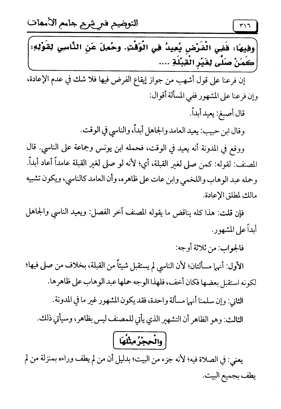 وفِيهَا: فَفِي الْفَرْضِ يُعيد فِي الْوَقْتِ. وحُمِلَ عَنِ النَّاسِي لِقَوْلِهِ: كَمَنْ صَلَّى لِغَيْرِ الْقِبْلَةِ .....