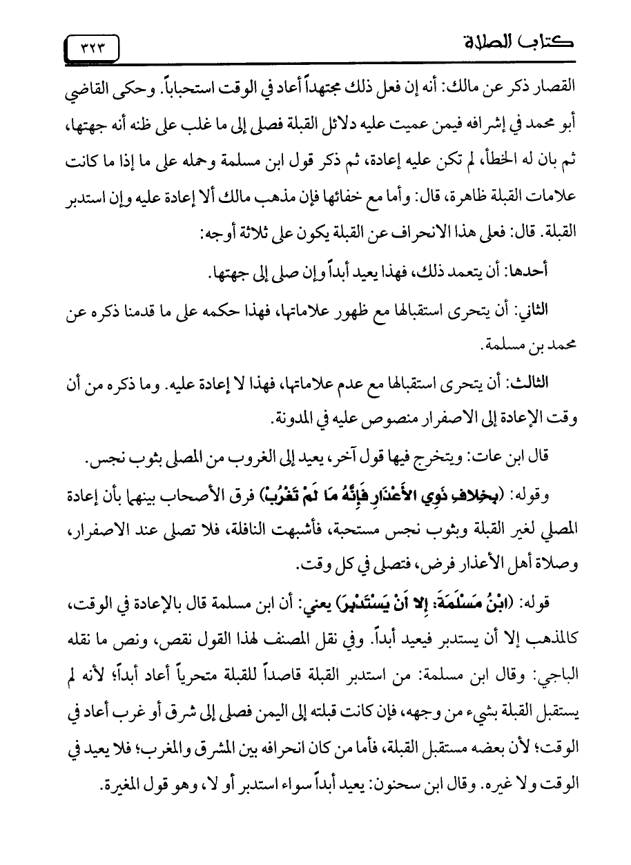 القصار ذكر عن مالك: أنه إن فعل ذلك مجتهداً أعاد في الوقت استحباباً. وحكى القاضي أبو محمد في إشرافه فيمن عميت عليه دلائل القبلة فصلى إلى ما غلب على ظنه أنه جهتها، ثم بان له الخطأ، لم تكن عليه إعادة، ثم ذكر قول ابن مسلمة وحمله على ما إذا ما كانت علامات القبلة ظاهرة، قال: وأما مع خفائها فإن مذهب مالك ألا إعادة عليه وإن استدبر القبلة. قال: فعلى هذا الانحراف عن القبلة يكون على ثلاثة أوجه:
