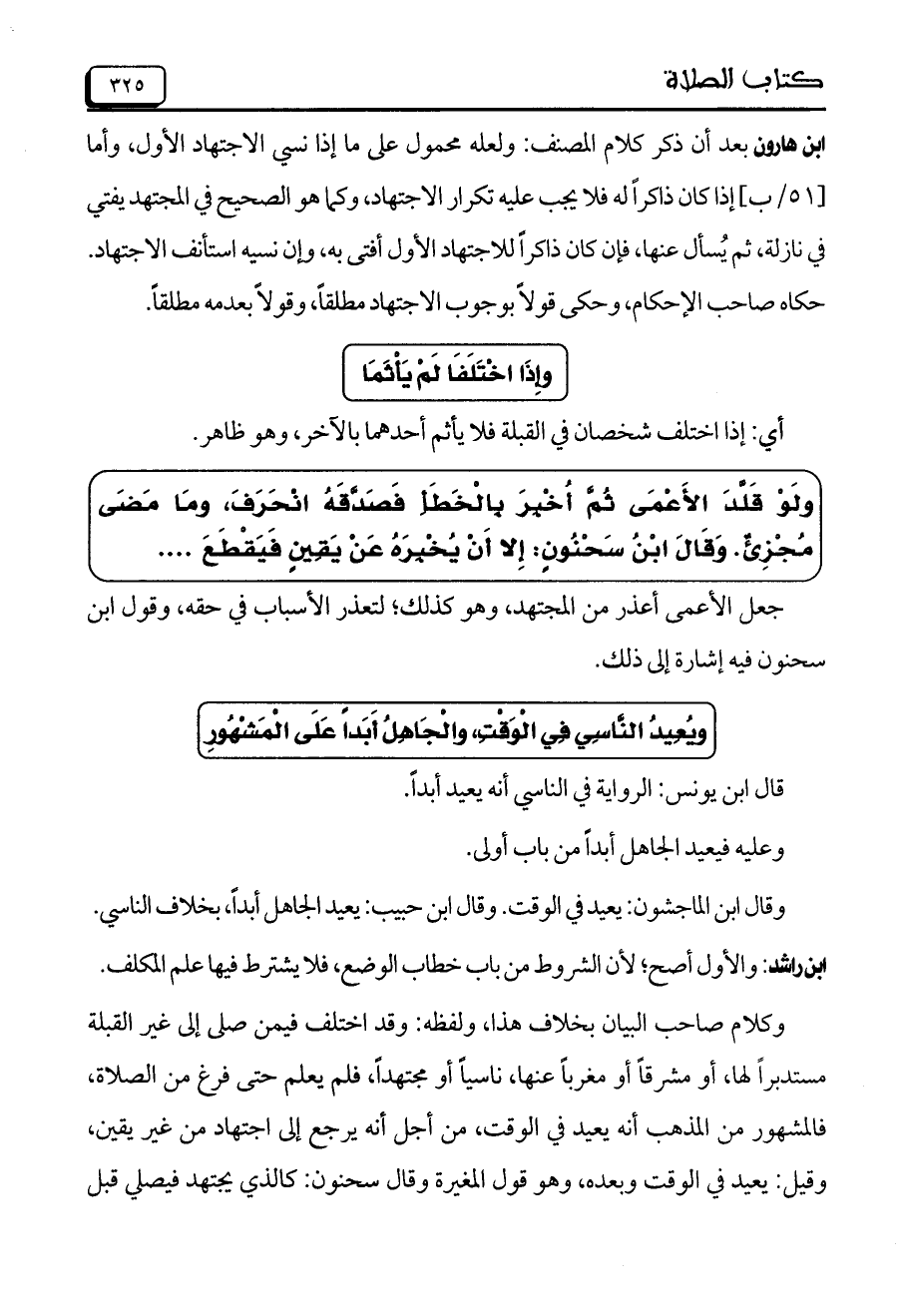 وكلام صاحب البيان بخلاف هذا، ولفظه: وقد اختلف فيمن صلى إلى غ ير القبلة مستدبراً لها، أو مشرقاً أو مغرباً عنها، ناسياً أو مجتهداً، فلم يعلم حتى فرغ من الصلاة، فالْمَشْهُورِ من المذهب أنه يُعيد في الوقت، من أجل أنه يرجع إلى اجتهاد من غير يقين، وقيل: يُعيد في الوقت وبعده، وهو قول المغيرة وقال سحنون: كالذي يجتهد فيصلي قبل