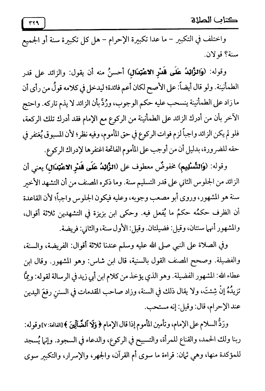 وقوله: (وَالتَّسْلِيمِ) مخفوضٌ معطوف على (الزَّائِدُ عَلَى قَدْرِ الاعْتِدَالِ) يعني أن الزائد من الجلوس الثاني على قدر التسليم سنة. وما ذكره المصنف من أن التشهد الأخير سنة هو الْمَشْهُورِ، وروى أبو مصعب وجوبه، وعليه فيكون الجلوس واجباً؛ لأن القاعدة أن الظرف حكمُه ما يُفعل فيه. وحكى ابن بزيزة في التشهدين ثلاثة أقوال، والْمَشْهُورِ أنهما سنتان، وقيل: فضيلتان. وقيل: الأول سنة، والثاني: فريضة.