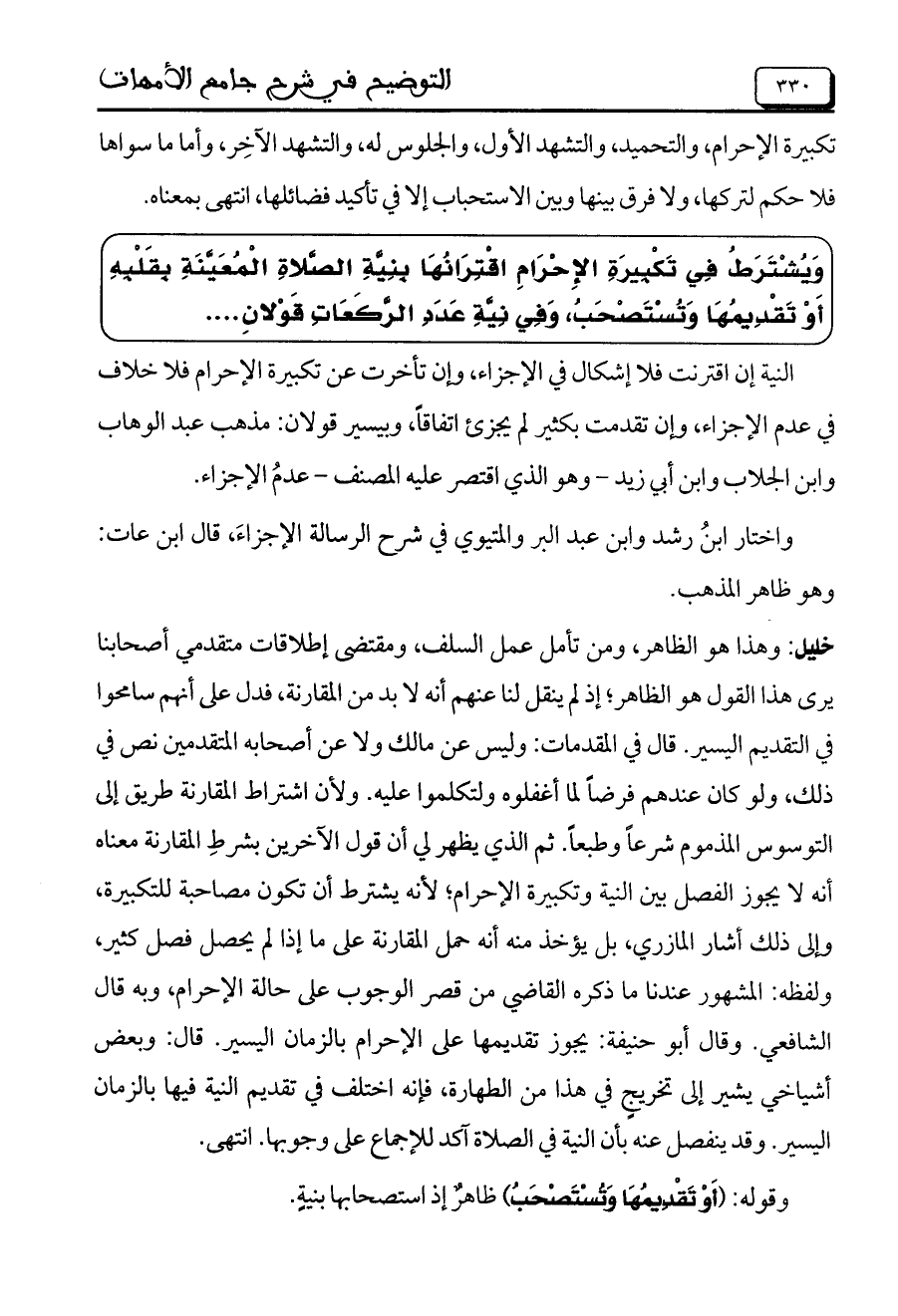 خليل: وهذا هو الظاهر، ومن تأمل عمل السلف، ومقتضى إطلاقات متقدمي أصحابنا يرى هذا القول هو الظاهر؛ إذ لم ينقل لنا عنهم أنه لابد من المقارنة، فدل على أنهم سامحوا في التقديم اليسير. قال في المقدمات: وليس عن مالك ولا عن أصحابه المتقدمين نص في ذلك، ولو كان عندهم فرضاً لما أغفلوه ولتكملوا عليه. ولأن اشتراط المقارنة طريق إلى التوسوس المذموم شرعاً وطبعاً. ثم الذي يظهر لي أن قول الآخرين بشرطِ المقارنة معناه أنه لا يجوز الفصل بين النية وتكبيرة الإحرام؛ لأنه يشترط أن تكون مصاحبة للتكبيرة، وإلى ذلك أشار المازري، بل يؤخذ منه أنه حمل المقارنة على ما إذا لم يحصل فصل كثير، ولفظه: الْمَشْهُورِ عندنا ما ذكره القاضي من قصر الوجوب على حالة الإحرام، وبه قال الشافعي. وقال أبو حنيفة: يجوز تقديمها على الإحرام بالزمان اليسير. قال: وبعض أشياخي يشير إلى تخريجٍ في هذا من الطهارة، فإنه اختلف في تقديم النية فيها بالزمان اليسير. وقد ينفصل عنه بأن النية في الصلاة آكد للإجماع على وجوبها. انتهى.