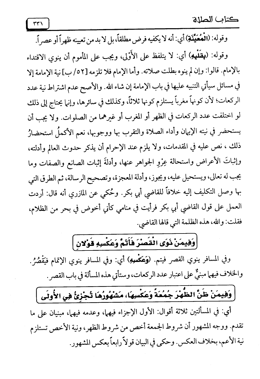 وقوله: (بِقَلْبِهِ) أي: لا يتلفظ على الأَوْلَى، ويجب على المأموم أن ينوي الاقتداء بالإمام. قالوا: وإن لم ينوه بطلت صلاته. وأما الإمام فلا تلزمه [52/ب] نية الإمامة إلا في مسائل سيأتي التنبيه عليها في باب الإمامة إن شاء الله. والأصح عدم اشتراط نية عدد الركعات؛ لأن كونها مغرباً يستلزم كونها ثلاثاً، وكذلك في سائرها، وإنما يحتاج إلى ذلك لو اختلفت عدد الركعات في الظهر أو المغرب أو غيرهما من الصلوات. ولا يجب أن يستحضر في نيته الإيمان وأداء الصلاة والتقرب بها ووجوبها، نعم الأكملُ استحضارُ ذلك، نص عليه في المقدمات، ولا يلزم عند الإحرام أن يذكر حدوث العالم وأدلته، وإثباتَ الأعراض واستحالة عِرْوِ الجواهر عنها، وأدلةَ إثبات الصانع والصفات وما يجب له تعالى، ويستحيل عليه، ويجوز، وأدلة المعجزة، وتصحيح الرسالة، ثم الطرق التي بها وصل التكليف إليه خلافاً للقاضي أبي بكر. وحُكي عن المازري أنه قال: أردت العمل على قول القاضي أبي بكر فرأيت في منامي كأني أخوض في بحر من الظلام، فقلت: والله، هذه الظلمة التي قالها القاضي.