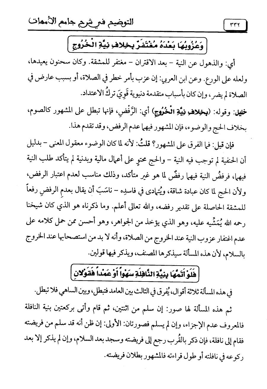 خليل: وقوله: (بِخِلافِ نِيَّةِ الْخُرُوجِ) أي: الرَّفْضِ، فإنها تبطل على الْمَشْهُورِ كالصوم، بخلاف الحج والوضوء، فإن الْمَشْهُورِ فيهما عدم الرفض، وقد تقدم هذا.